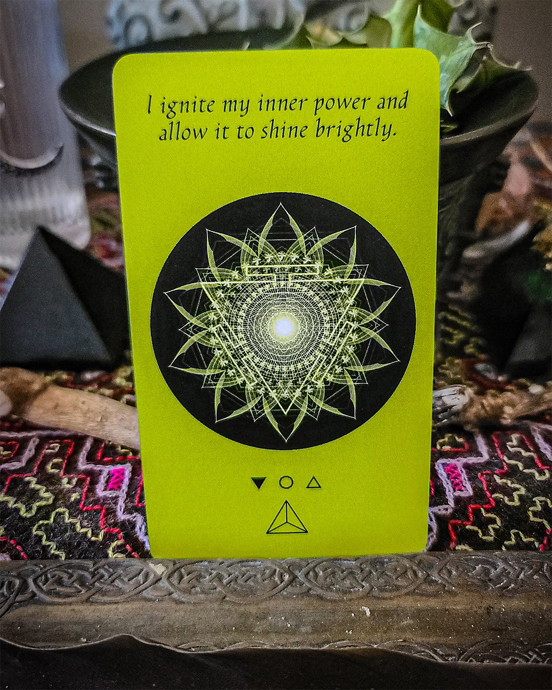 Reclaim Affirmation: “I ignite my inner power and allow it to shine brightly.”Chakra: ManipuraEnergetic State: Under-ActivePlatonic Solid: Tetrahedron This card points to an underactive Manipura, the solar plexus chakra. When