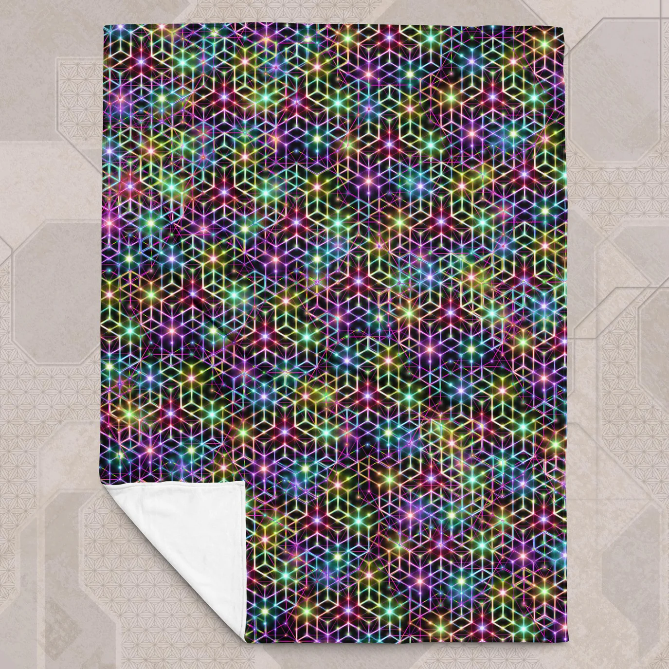 Whether you’re curled up at home, traveling, or spreading it out at a festival, this soft plush blanket is your go-to companion. Large enough to cover one person in cozy comfort or spacious enough to share, it also doubles as a protective ground covering for groups. Its UV/RGB light-reactive surface makes it an essential for music festivals, glowing vividly under blacklight. Crafted from recycled material, this eco-conscious blanket doesn’t just look good—it does good. Vibrant, durable, and fade-proof, this blanket is made for adventures that last a lifetime. Measures 57×77″
