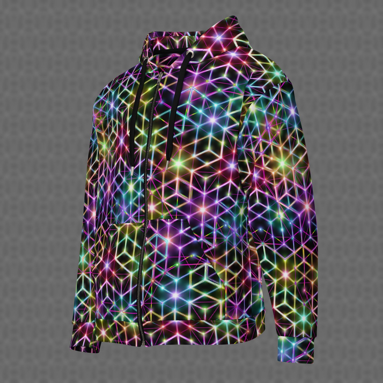 The 2CB all-over zip hoodie features radiant, rainbow on black prismatic geometric grids bursting with neon color, creating a high-energy, euphoric pattern that feels luminous, expansive, and visually electric. Under UV and RGB lighting environments, the colors shift, glow, and transform, bringing the artwork to life in immersive settings, making it ideal for immersive nightlife, psychedelic music environments, and moments designed to amplify color, sensation, and euphoric perception.