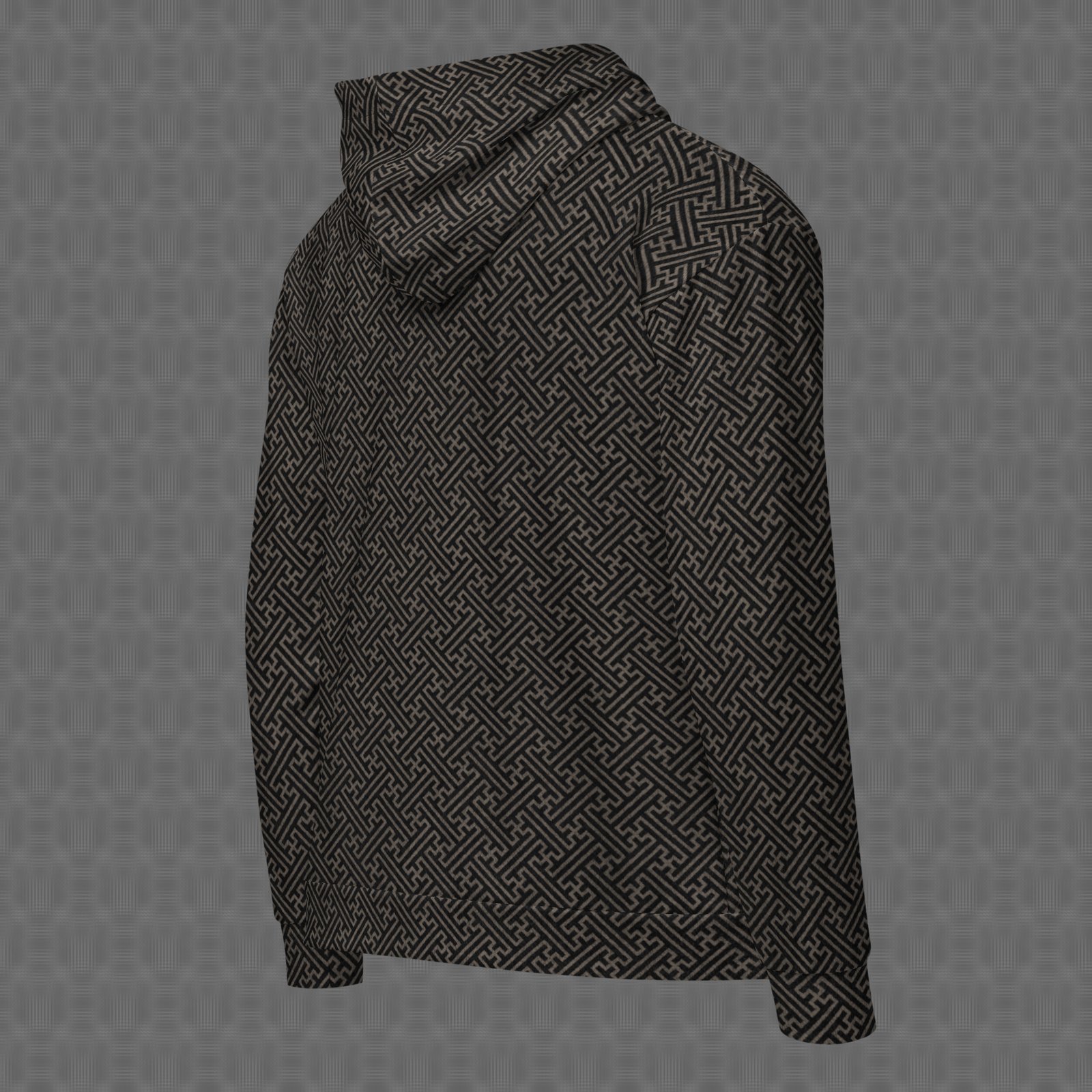 The Ancestral Sayagata all-over zip hoodie features a black and brown continuous interlocking key-pattern inspired by traditional sayagata motifs, creating a flowing, labyrinthine design that feels ancient and enduring. Under UV and RGB lighting environments, the colors shift, glow, and transform, bringing the artwork to life in immersive settings, making it ideal for heritage-inspired art spaces, contemplative environments, and settings centered on infinite pathways, continuity, and the symbolic geometry of enduring life patterns.