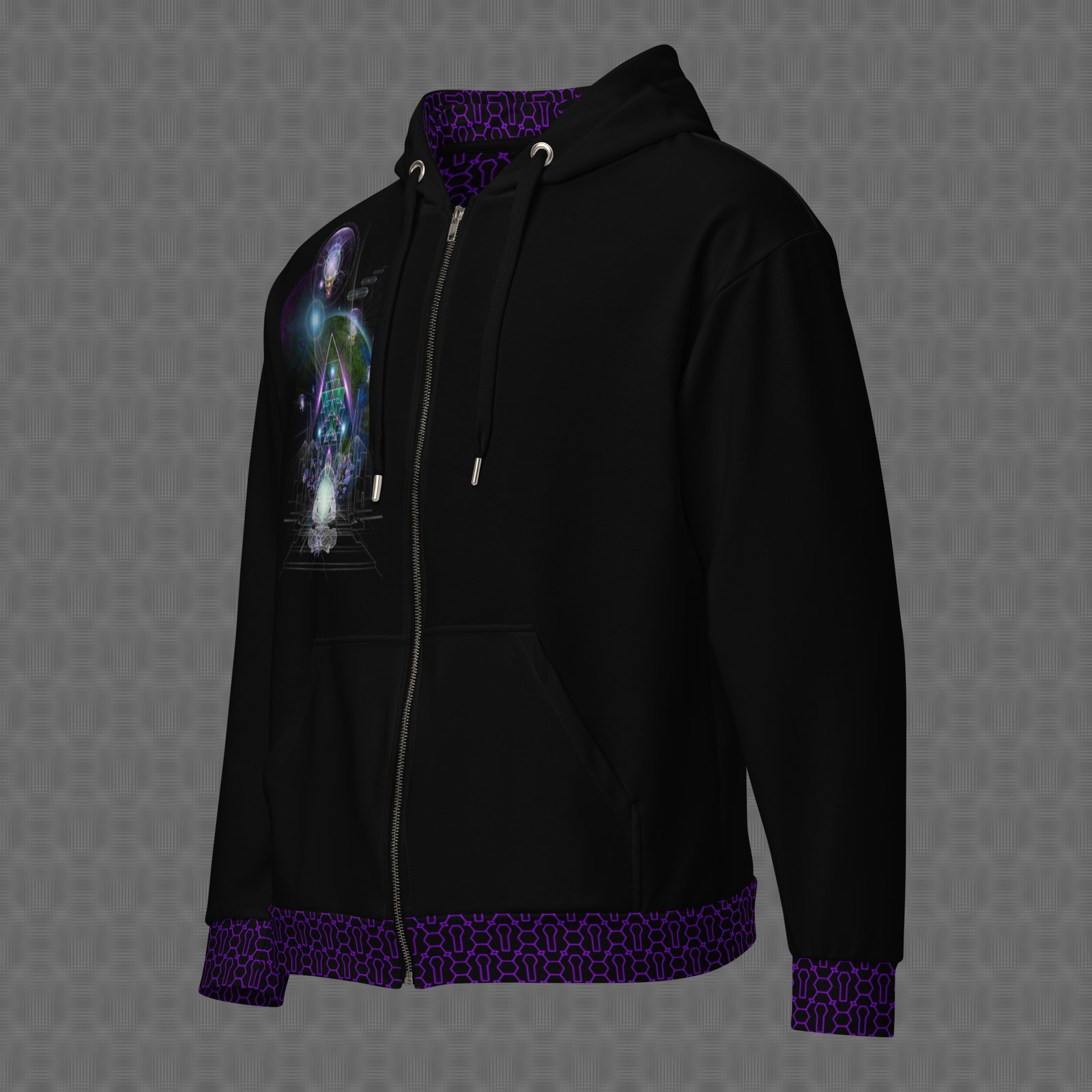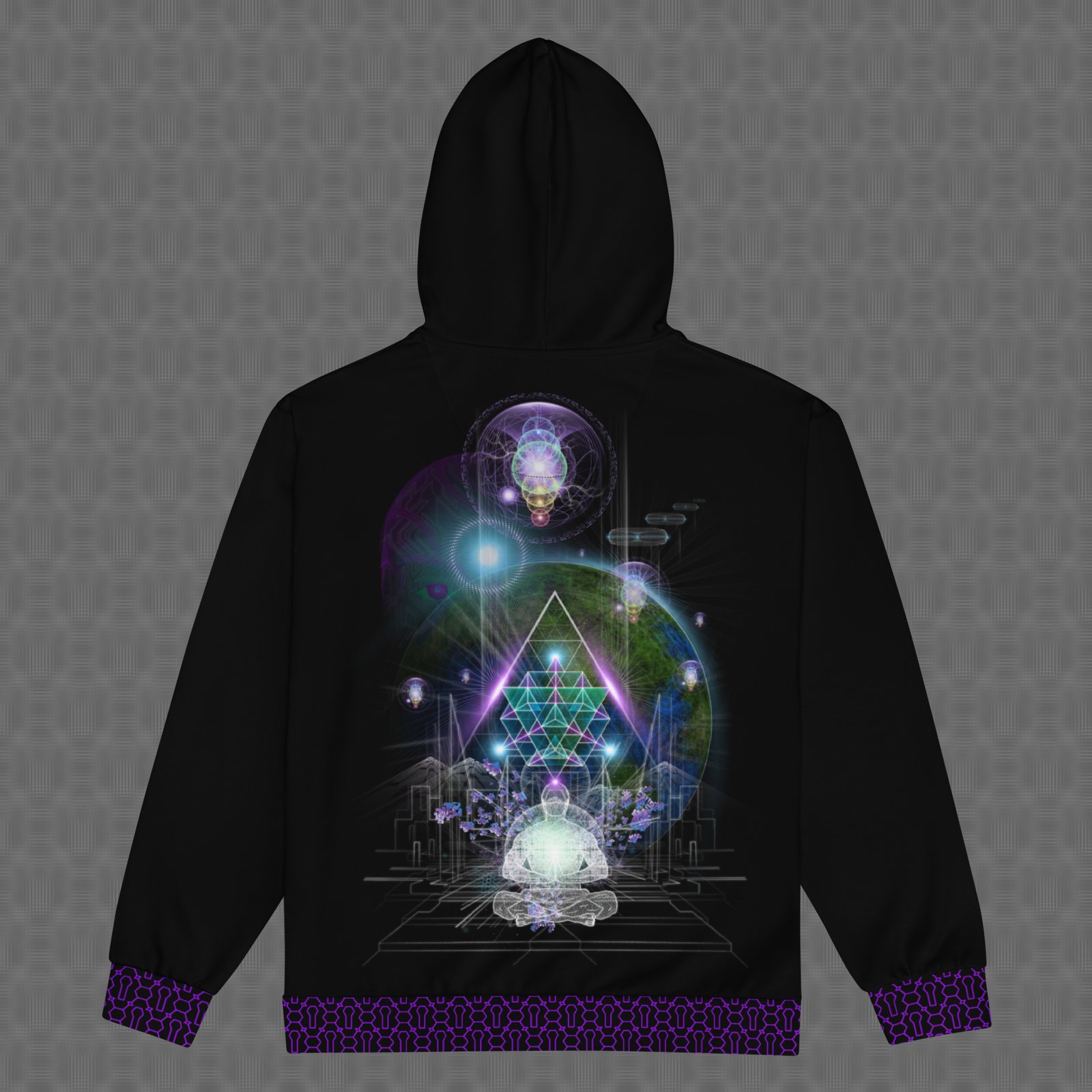 The Arcturus graphic zip hoodie features a meditating figure that radiates beneath crystalline stellar geometry and ascending light forms, channeling Arcturian symbolism of higher intelligence, coherence, and cosmic guidance. The design is presented as a large print across the back, with a smaller matching version on the chest. Under UV and RGB lighting environments, the colors shift, glow, and transform, bringing the artwork to life in immersive settings, making it ideal for meditation-centered art spaces, star-consciousness gatherings, and environments focused on higher intelligence, cosmic alignment, and interstellar guidance symbolism.