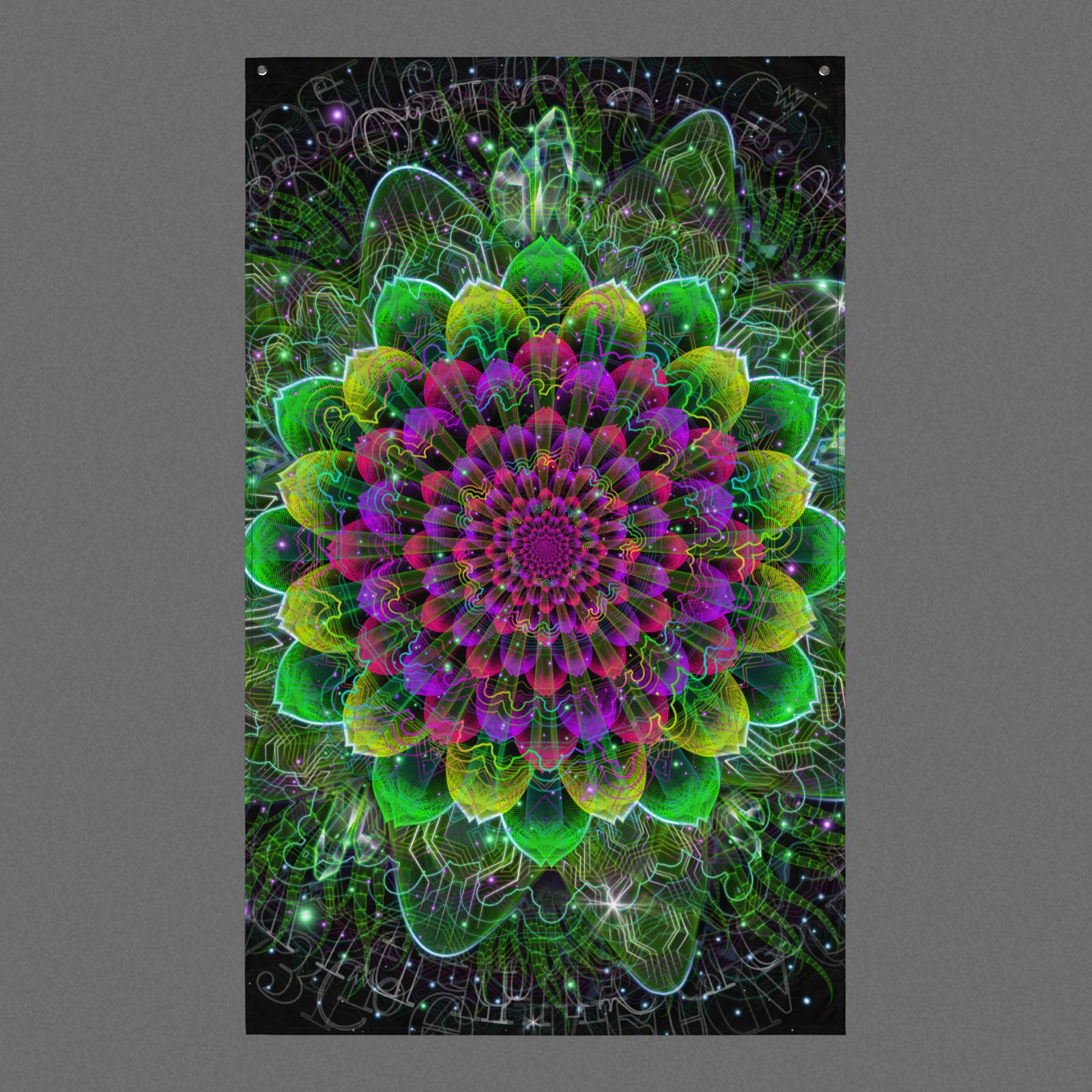 The Astral Flora close-up visionary art tapestry features a dense circular mandala of layered petal-like shapes, radiating outward in vivid greens and purples with fine luminous linework and intricate repeating details. Under UV and RGB lighting environments, the colors shift, glow, and transform, bringing the artwork to life in immersive settings.