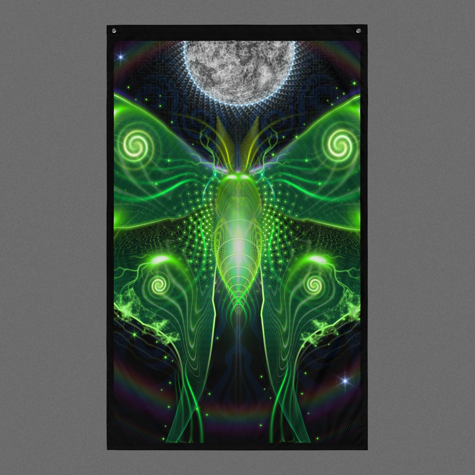- Depicts a bioluminescent luna moth with spirals and neon green glow