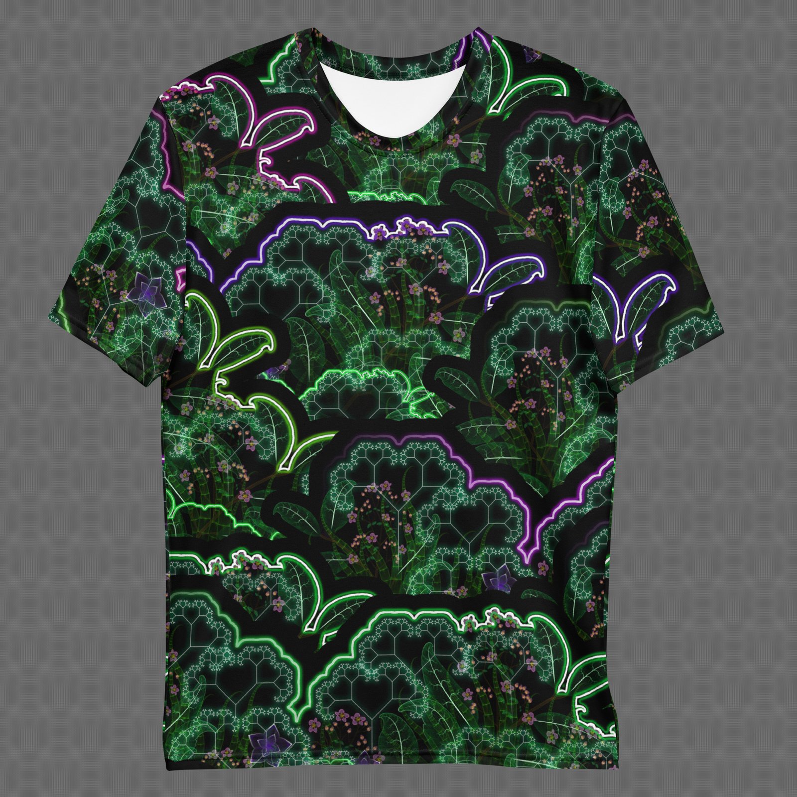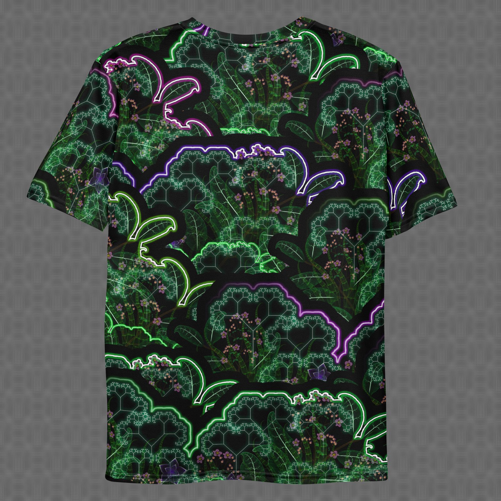 The Biosynthebliss all-over t-shirt features layered organic forms pattern resembling leaves and cellular membranes interlock across a dark field, traced with glowing green and violet outlines and punctuated by fine lattice textures and small floral accents. Under UV and RGB lighting environments, the colors shift, glow, and transform, bringing the artwork to life in immersive settings, making it resonate within psychedelic fashion circles, music-driven gatherings, and immersive visual culture, and those drawn to botanical geometry, organic lattice structures, and UV-reactive design.