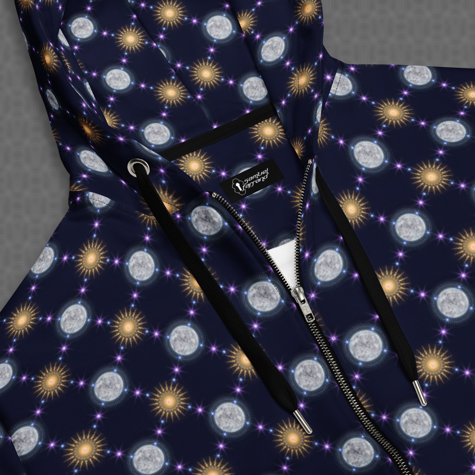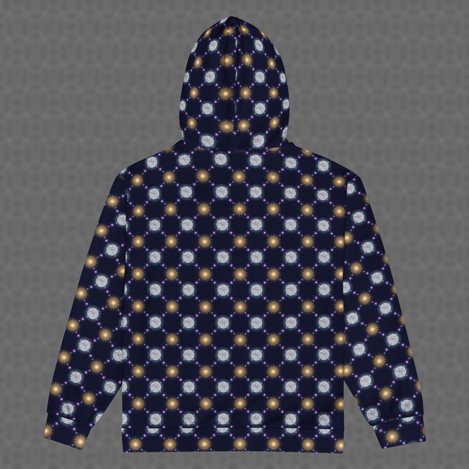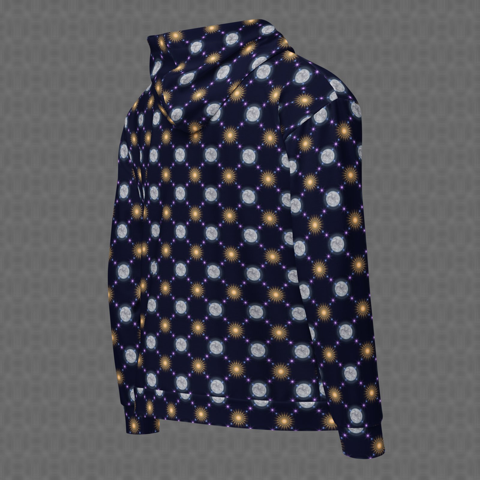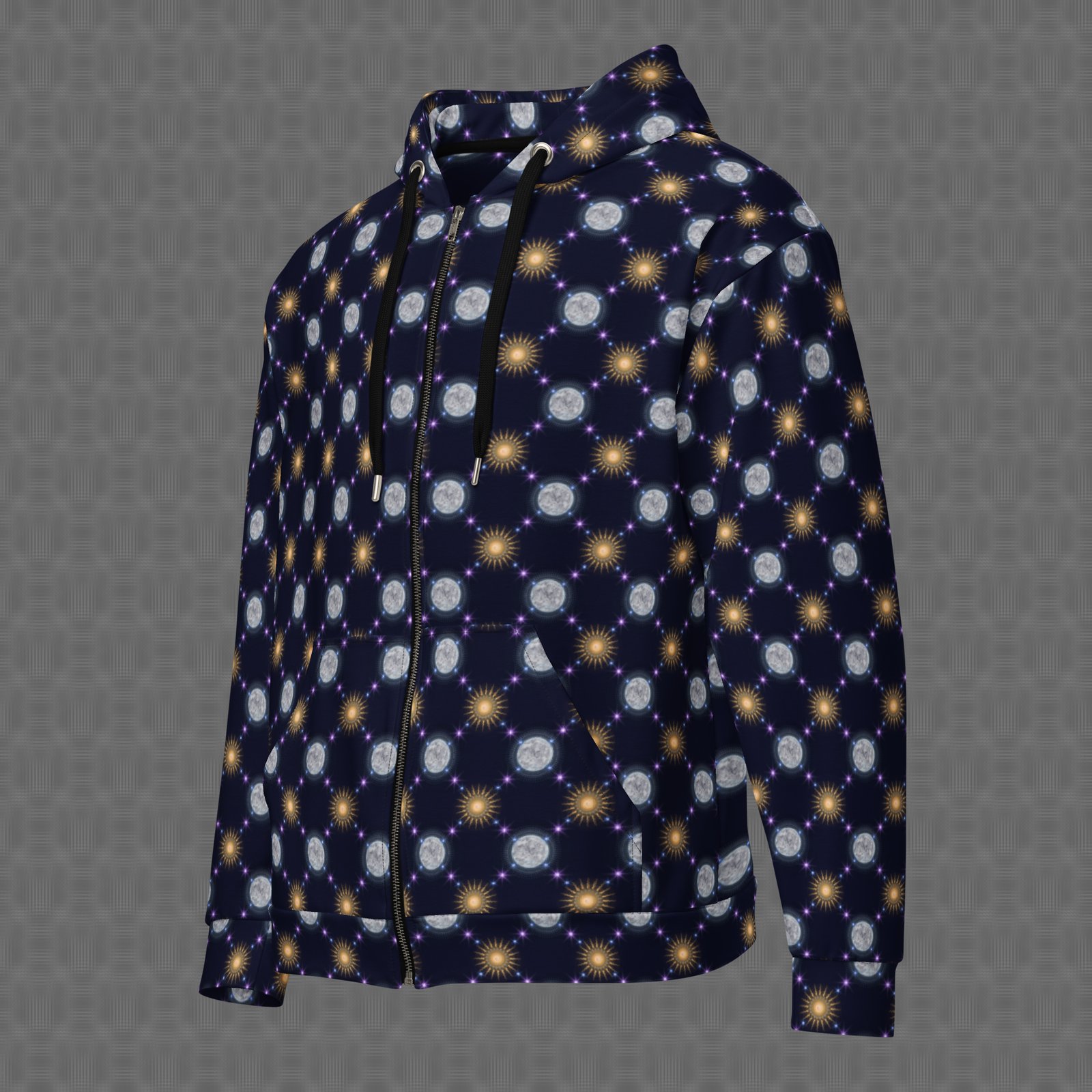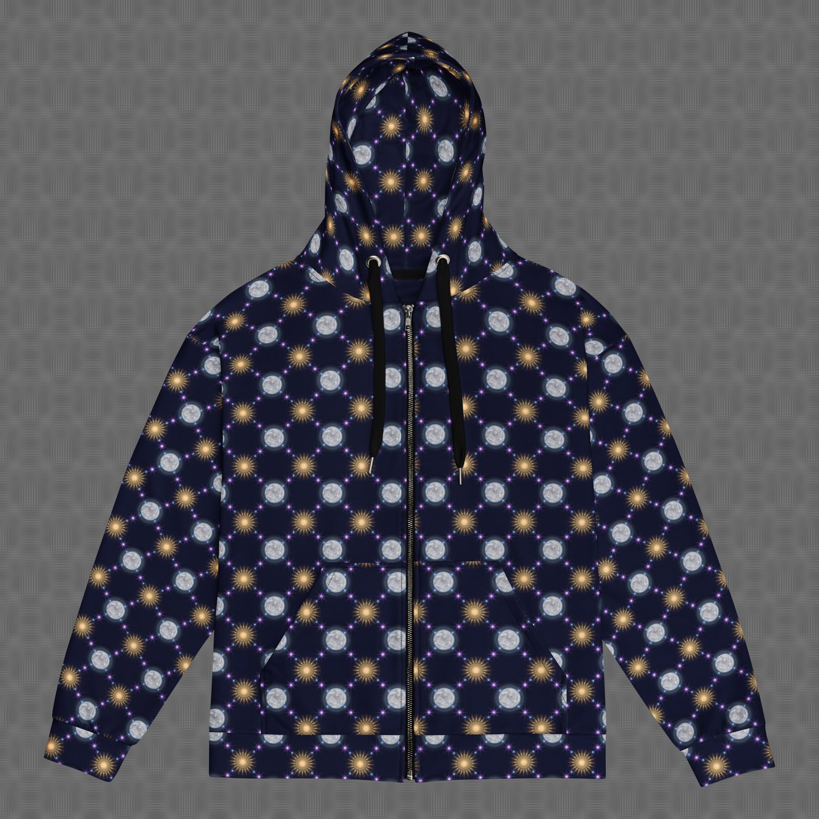 The Celestial Bodies all-over zip hoodie features a vivid cosmic pattern of repeating suns and moons linked by glowing star-like nodes, forming a rhythmic constellation across deep space tones. Under UV and RGB lighting environments, the colors shift, glow, and transform, bringing the artwork to life in immersive settings, making it ideal for celestial-themed gatherings, nighttime festivals, and psychedelic environments centered on cosmic cycles, astral symbolism, and the rhythm of sun, moon, and star patterns.