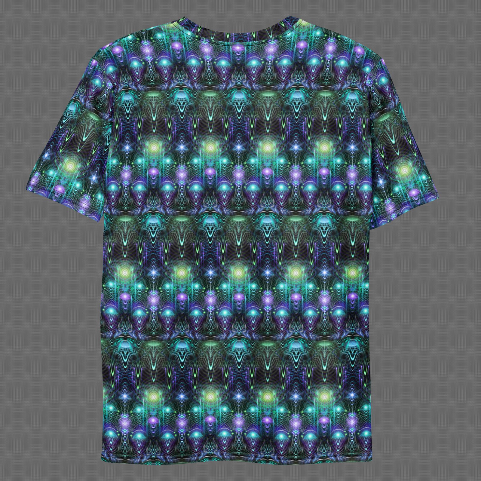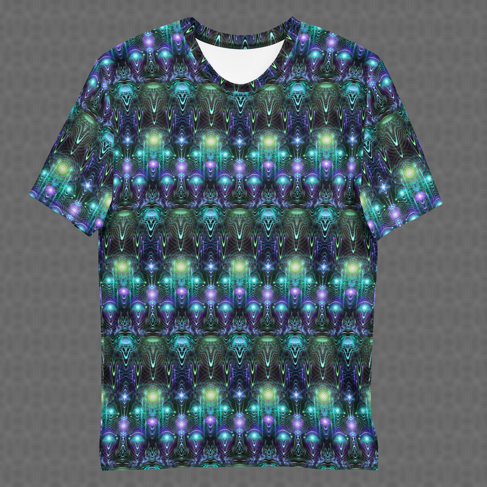 The Cernunnos all-over t-shirt features a repeating totemic pattern of luminous green and violet forms that evokes horned forest spirits and flowing life-force energy within a deep psychedelic field. Under UV and RGB lighting environments, the colors shift, glow, and transform, bringing the artwork to life in immersive settings, making it root itself in primal visual mythology, immersive natural-symbolic environments, and powerful statement wear, and those drawn to totemic geometry, forest-spirit symbolism, and UV-reactive design.