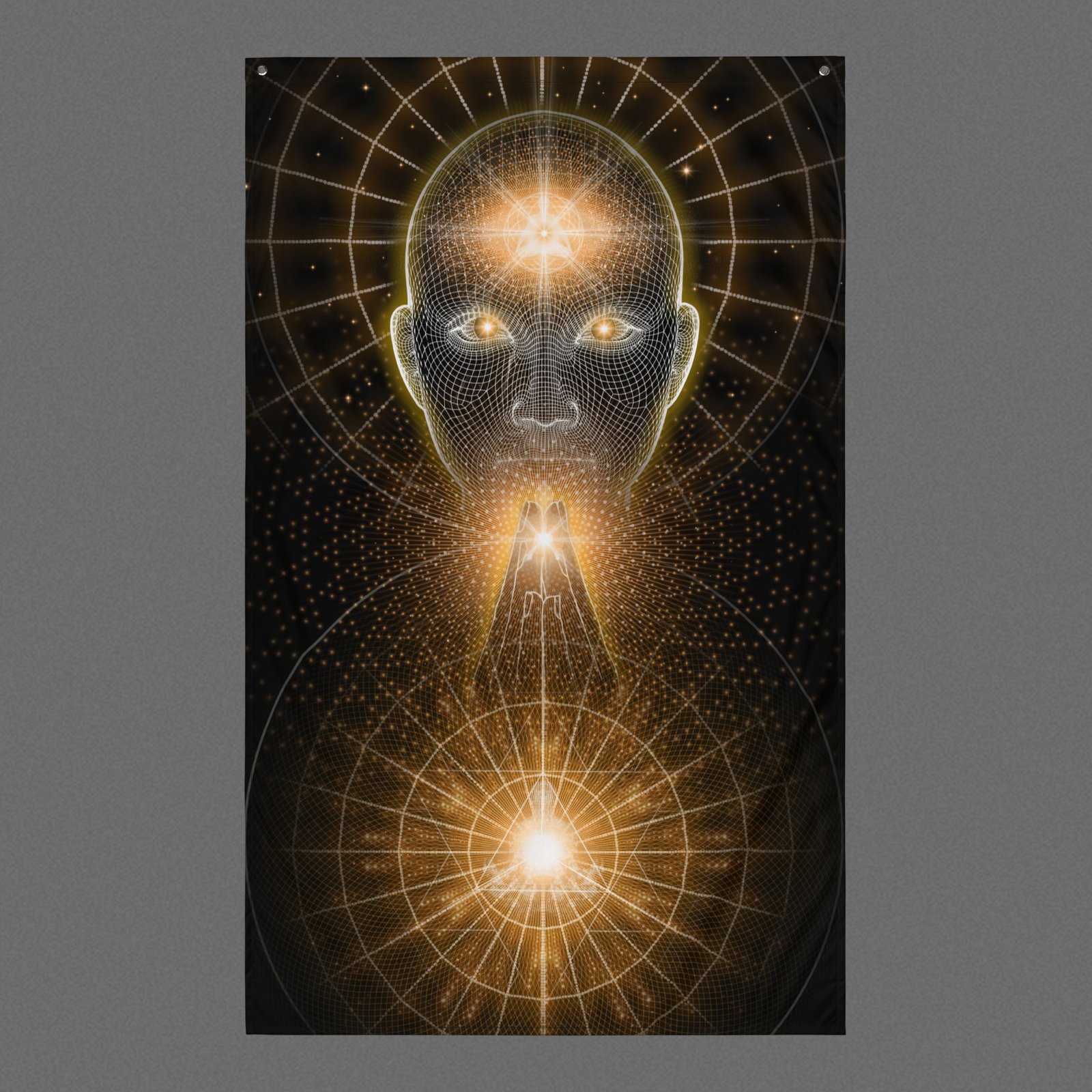 The Coherence close-up visionary art tapestry features a luminous human face rendered in fine linework, surrounded by concentric geometric grids, with bright golden light radiating from the forehead, throat, and lower circular form. Under UV and RGB lighting environments, the colors shift, glow, and transform, bringing the artwork to life in immersive settings, making it hold presence within introspective visual spaces, meditation-oriented interiors, and detail-focused wall displays, and those drawn to illuminated facial symbolism, golden geometric light, and UV-reactive visionary art.