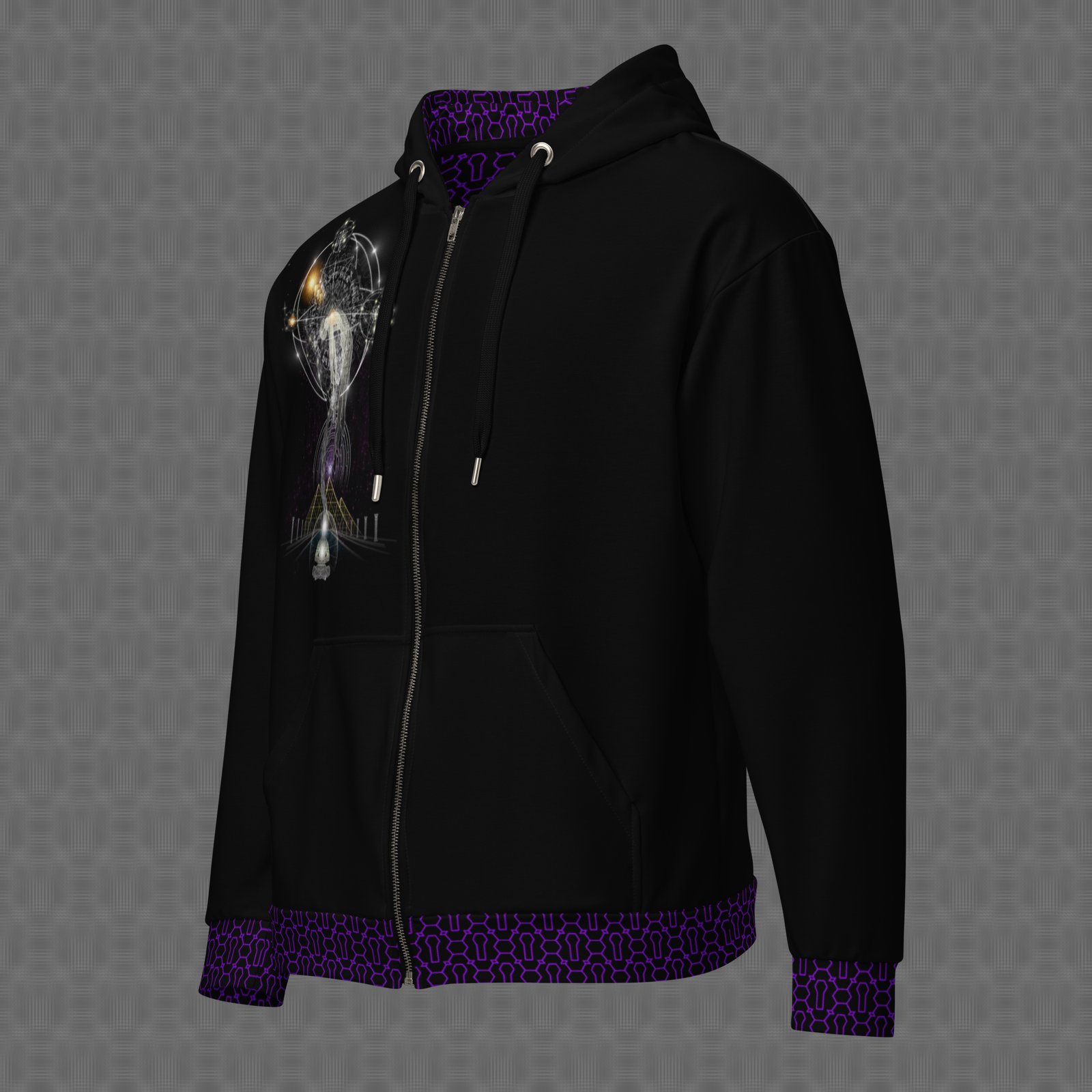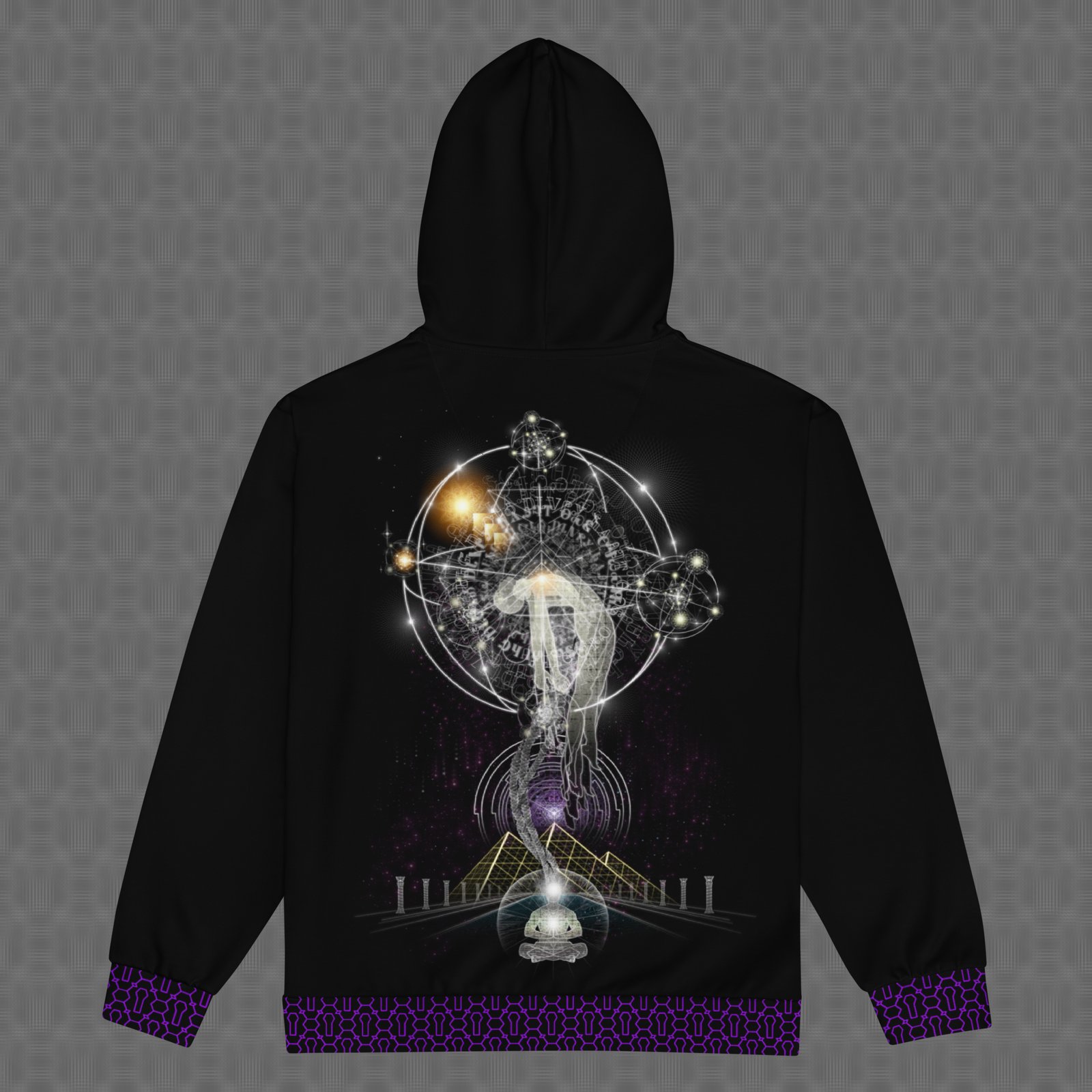 The Conscendo Animus graphic zip hoodie features an ascending luminous figure that intertwines with cosmic arcs, sacred geometry, and celestial symbols, representing the soul’s rise through matter, mind, and infinite consciousness. The design is presented as a large statement print across the back, with a smaller matching version on the chest. Under UV and RGB lighting environments, the colors shift, glow, and transform, bringing the artwork to life in immersive settings, making it ideal for visionary spiritual gatherings, transformational art spaces, and environments centered on ascension symbolism, sacred geometry, and the evolution of consciousness.