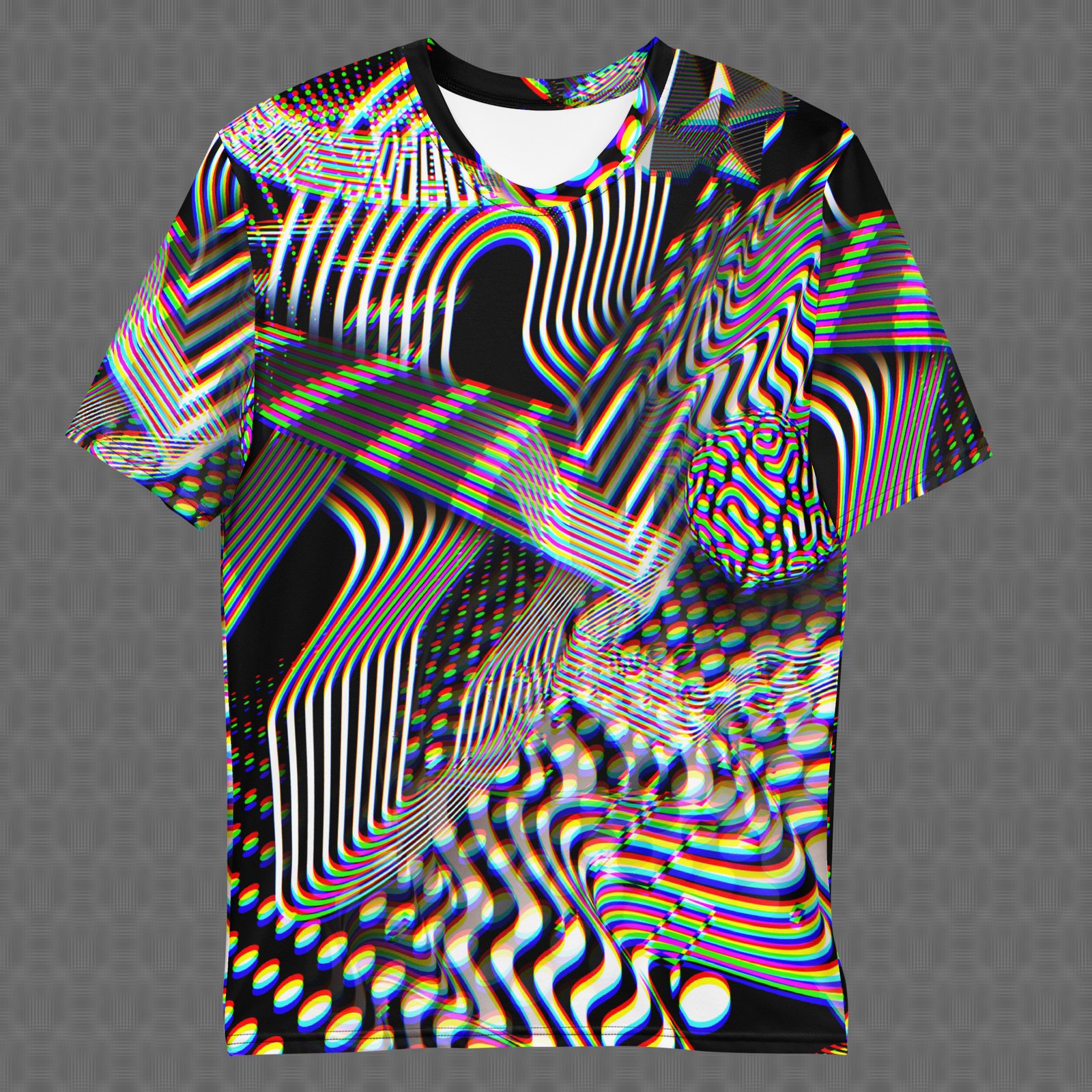 The Dissolution all-over t-shirt features A high-contrast chromatic abberation composition of warped lines, glitch textures, and optical distortions that creates the sensation of form breaking down into pure visual noise. Under UV and RGB lighting environments, the colors shift, glow, and transform, bringing the artwork to life in immersive settings, making it feel at home in experimental visual culture, high-contrast statement styling, and perception-bending environments, and those drawn to glitch distortion, optical noise, and UV-reactive design.
