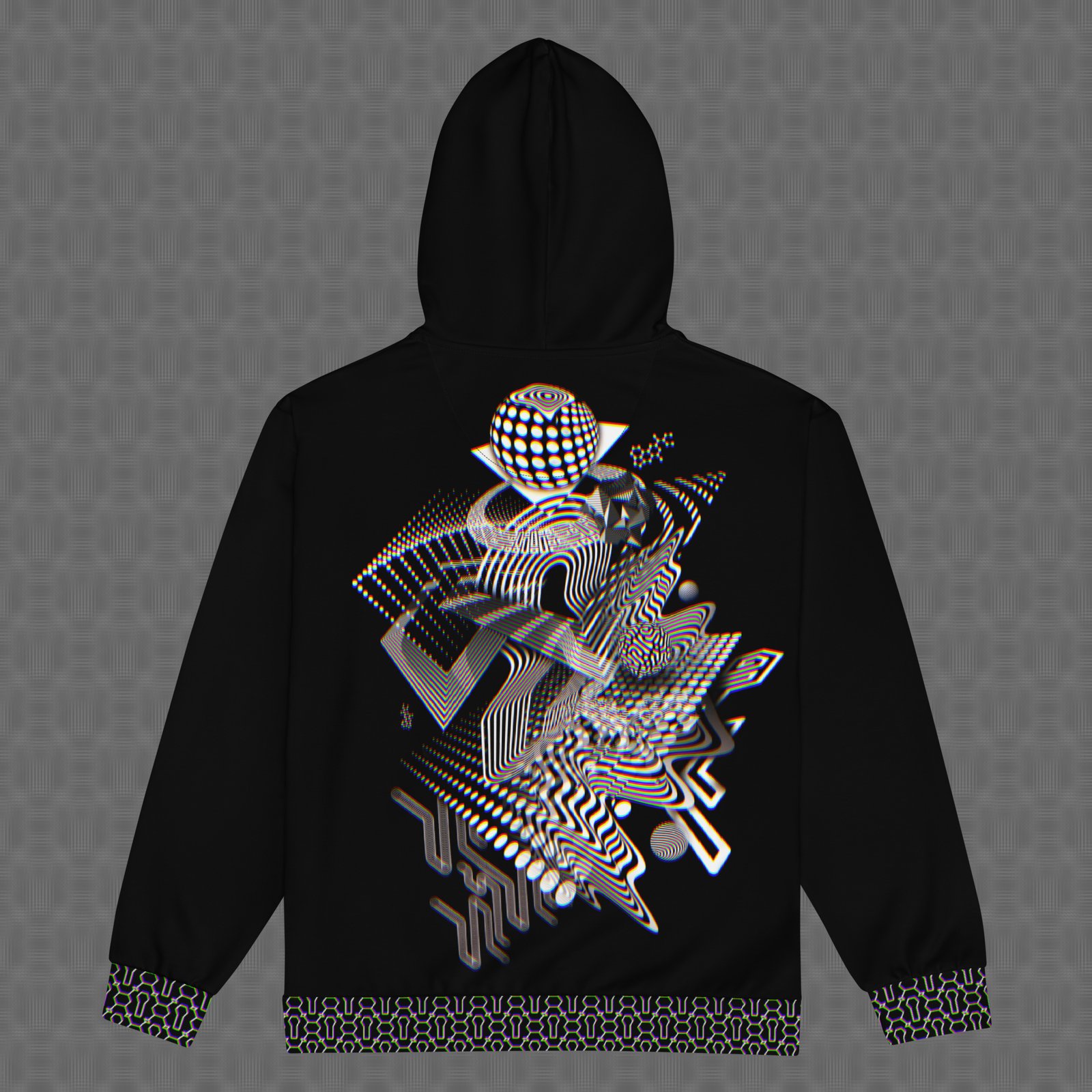 The Dissolution graphic zip hoodie features a fragmented field of warped lines, oscillating patterns, and collapsing geometry that visualizes dissolution as form breaks down into signal, noise, and raw perception. The design is presented as a large print across the back, with a smaller matching version on the chest. Under UV and RGB lighting environments, the colors shift, glow, and transform, bringing the artwork to life in immersive settings, making it ideal for experimental art spaces, introspective psychedelic environments, and gatherings centered on deconstruction, ego dissolution, and the collapse of familiar perceptual frameworks.