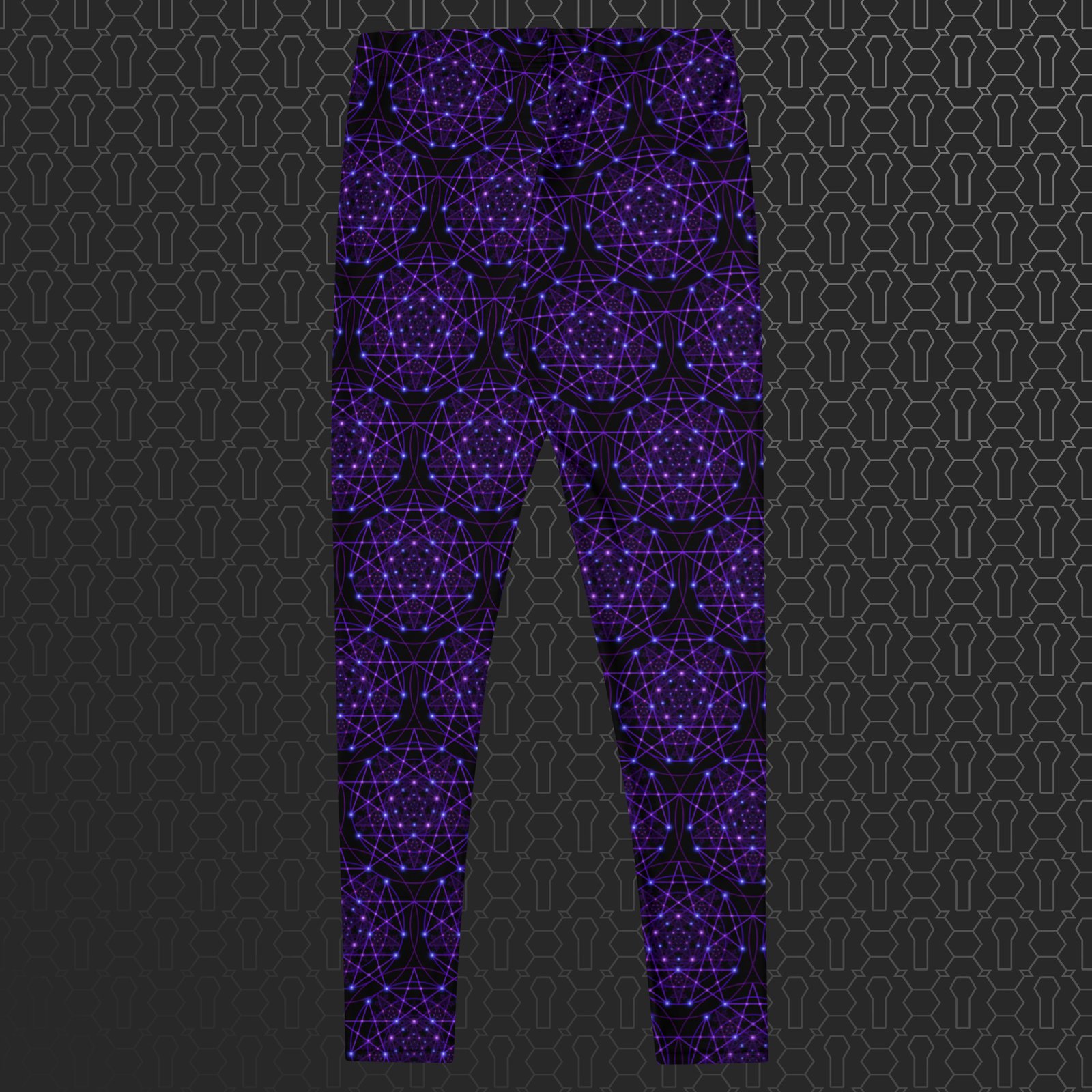 The UV-reactive, fade-resistant psychedelic print glows under blacklight and stays vibrant over time. Designed with an elastic waistband and triple-stitched seams for lasting durability, they also feature UPF 50+ sun protection. Sustainably made from recycled textiles, these leggings deliver high-performance comfort with bold visual impact.