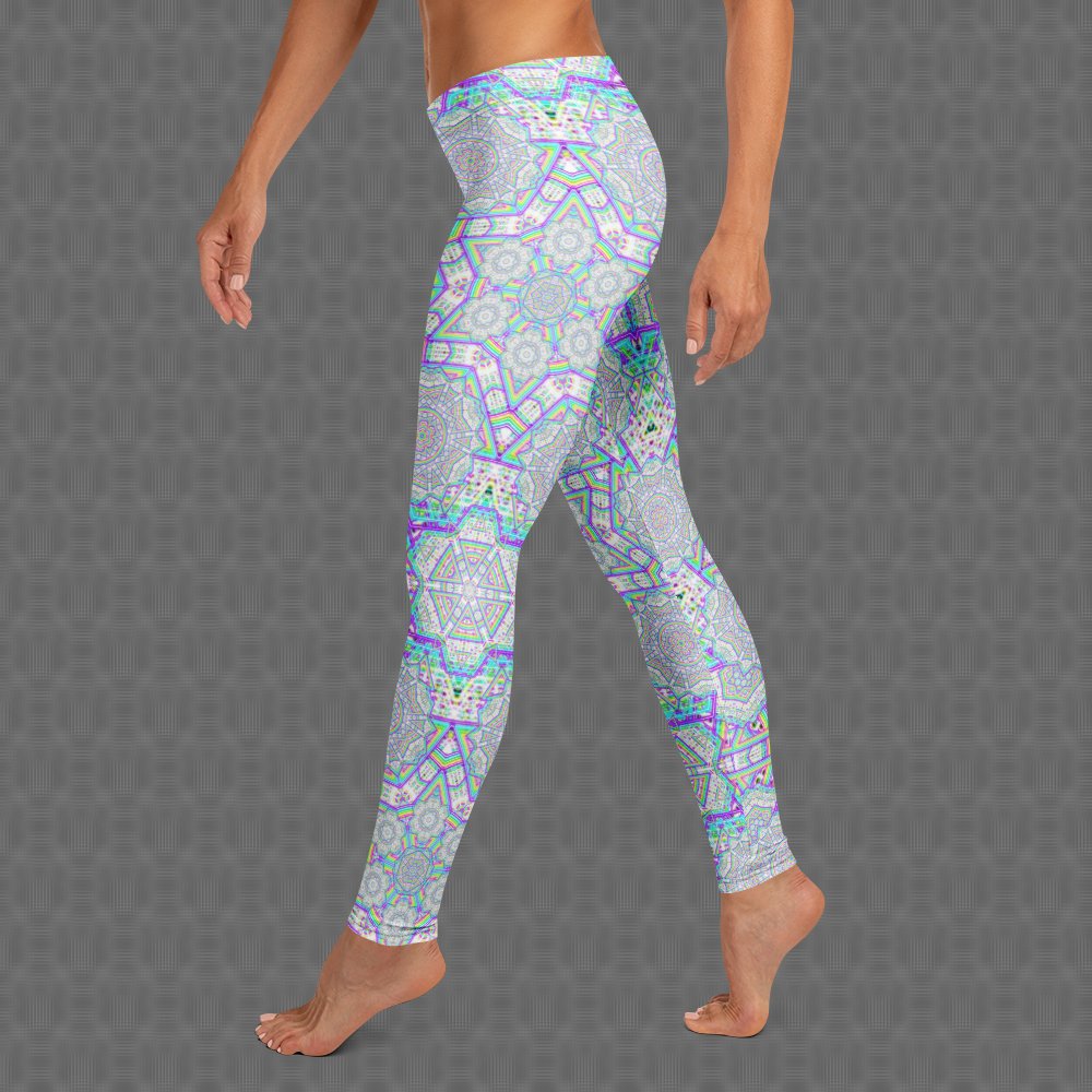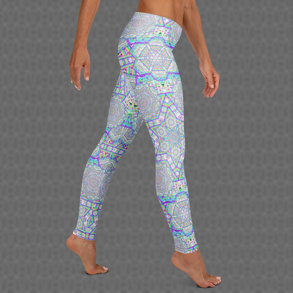 The UV-reactive, fade-resistant psychedelic print glows under blacklight and stays vibrant over time. Designed with an elastic waistband and triple-stitched seams for lasting durability, they also feature UPF 50+ sun protection. Sustainably made from recycled textiles, these leggings deliver high-performance comfort with bold visual impact.