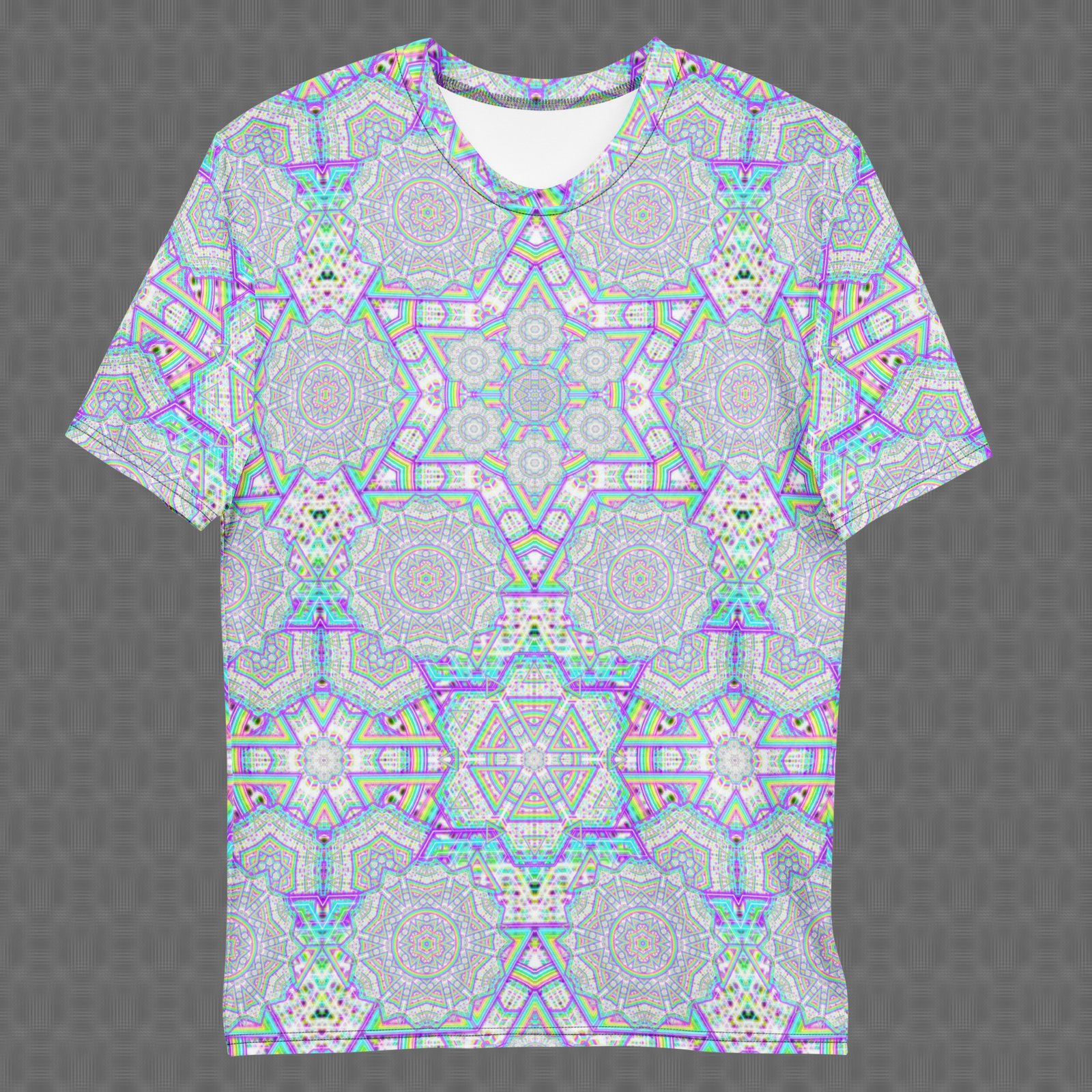 The Laniakea all-over t-shirt features intricate sacred geometry mandalas interlocking across a luminous pastel field, forming a precise yet ethereal pattern of symmetry and repetition. Under UV and RGB lighting environments, the colors shift, glow, and transform, bringing the artwork to life in immersive settings, making it align with meditative visual aesthetics, immersive pattern-focused environments, and harmony-driven statement wear, and those drawn to interlocking sacred geometry, mandala symmetry, and UV-reactive design.