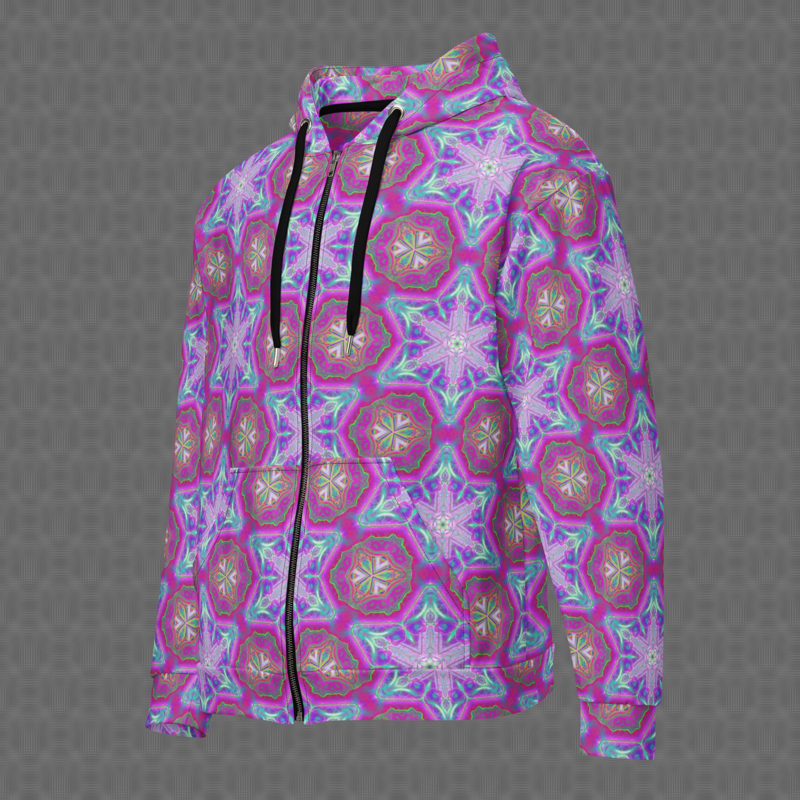 The Entheoelectric all-over zip hoodie radiates a crystalline mandala symmetry pattern, blending neon pinks, teals, and violets into a charged, visionary lattice of rhythmic energy. Under UV and RGB lighting environments, the colors shift, glow, and transform, bringing the artwork to life in immersive settings, making it ideal for psychedelic fashion seekers, festival and concert wear, immersive art and music environments, visionary streetwear styling, and those drawn to luminous mandala geometry and UV-reactive design.