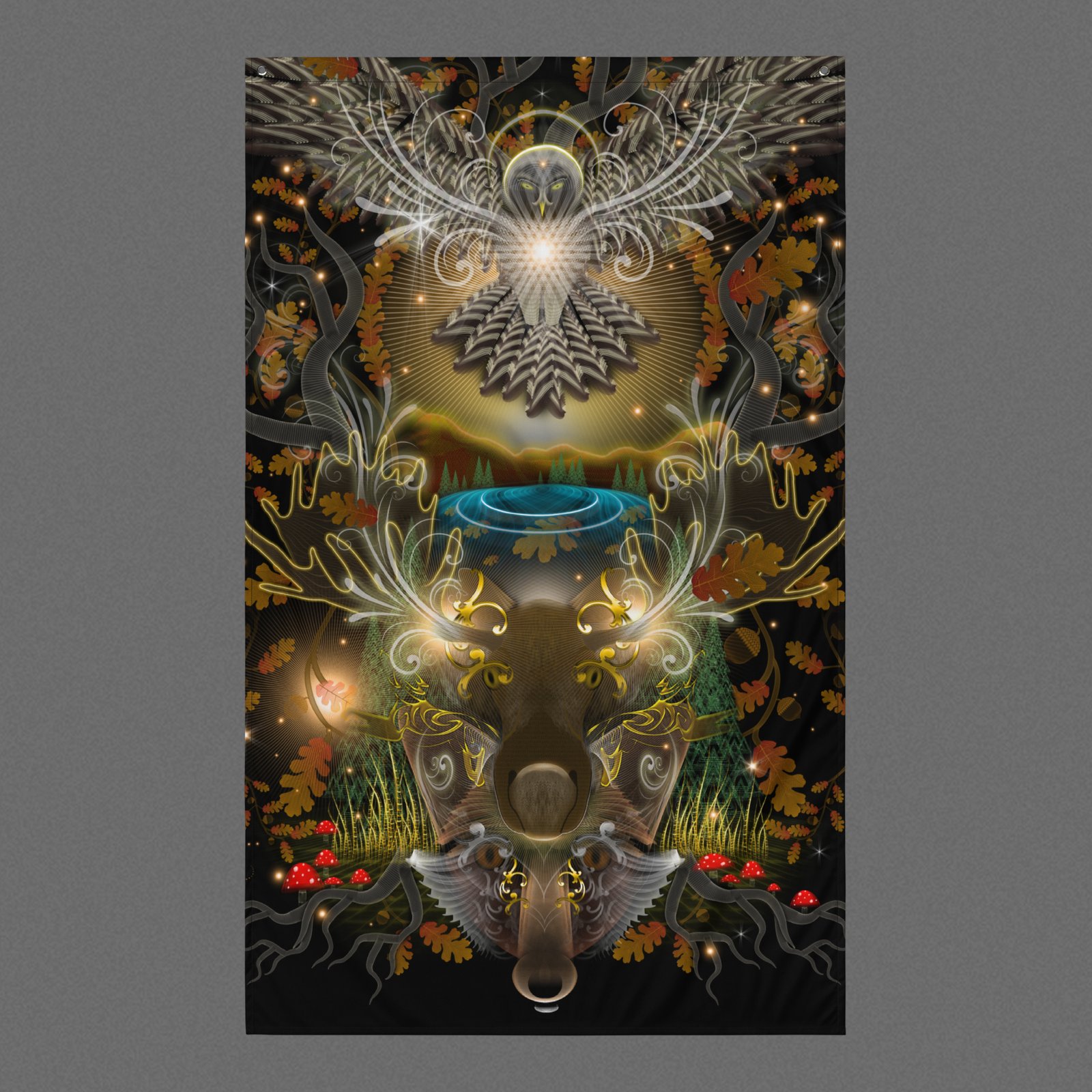 The Forestcopia close-up visionary art tapestry features a vertically stacked, symmetrical arrangement of layered wings, antlers, leaves, roots, glowing orbs, and flowing filigree lines rendered in gold, amber, teal, and earthy tones against a black background. Under UV and RGB lighting environments, the colors shift, glow, and transform, bringing the artwork to life in immersive settings, making it root itself within mythic natural interiors, earth-toned visual sanctuaries, and symbol-dense contemplative spaces, and those drawn to antlered forest iconography, layered organic geometry, and UV-reactive visionary art.