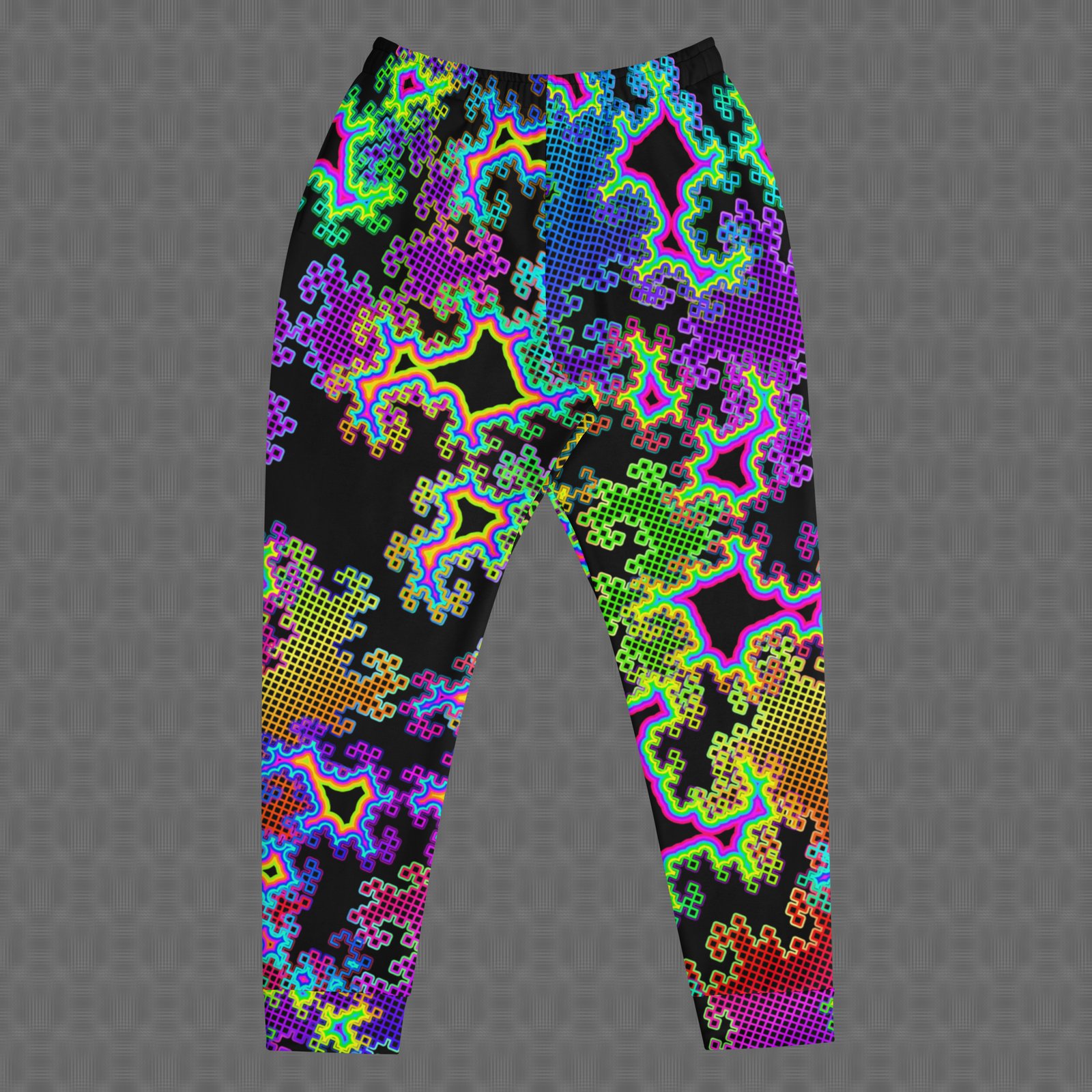 The slim fit and cuffed ankles create a clean, modern silhouette, while deep front pockets and a drawstring waist provide practical, secure comfort. Printed with UV-reactive, fade-resistant color on recycled materials, these joggers are made to move—whether you’re lounging, dancing, or out on the go.