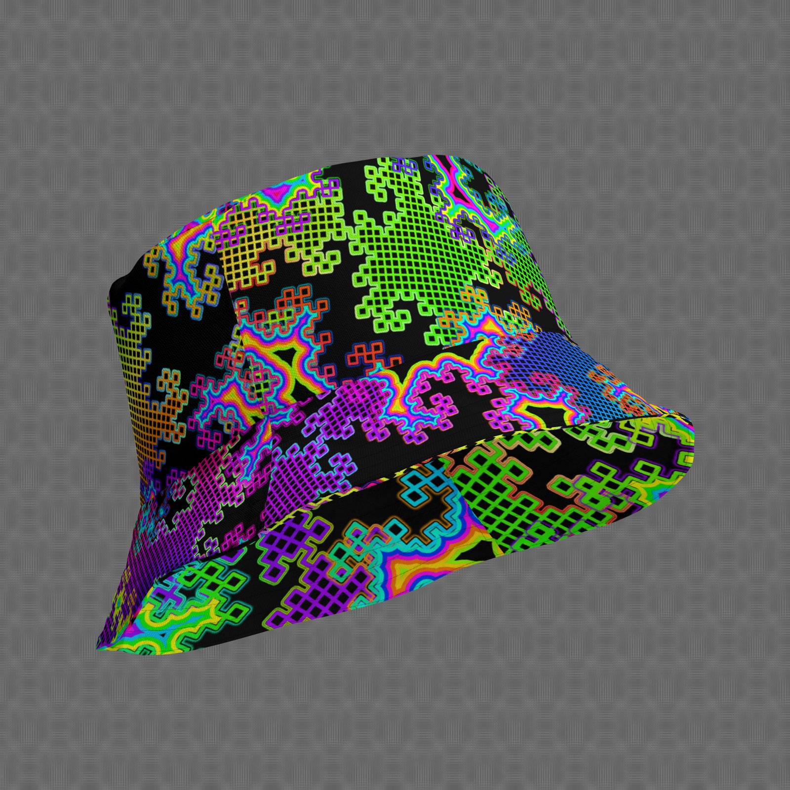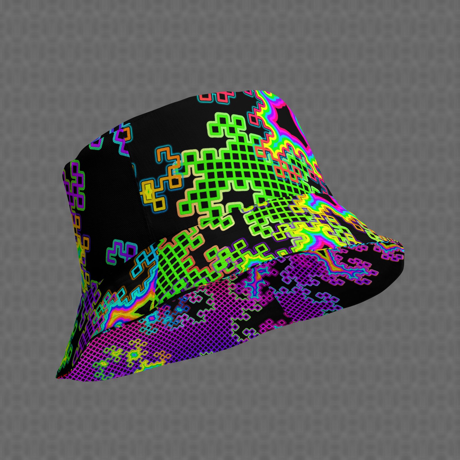 The Fractal Dream bucket hat features a vivid psychedelic rainbow dragon curve fractal pattern on a black background, giving it the appearance of glitched-out digital clouds. Under UV and RGB lighting environments, the colors shift, glow, and transform, bringing the artwork to life in immersive settings.