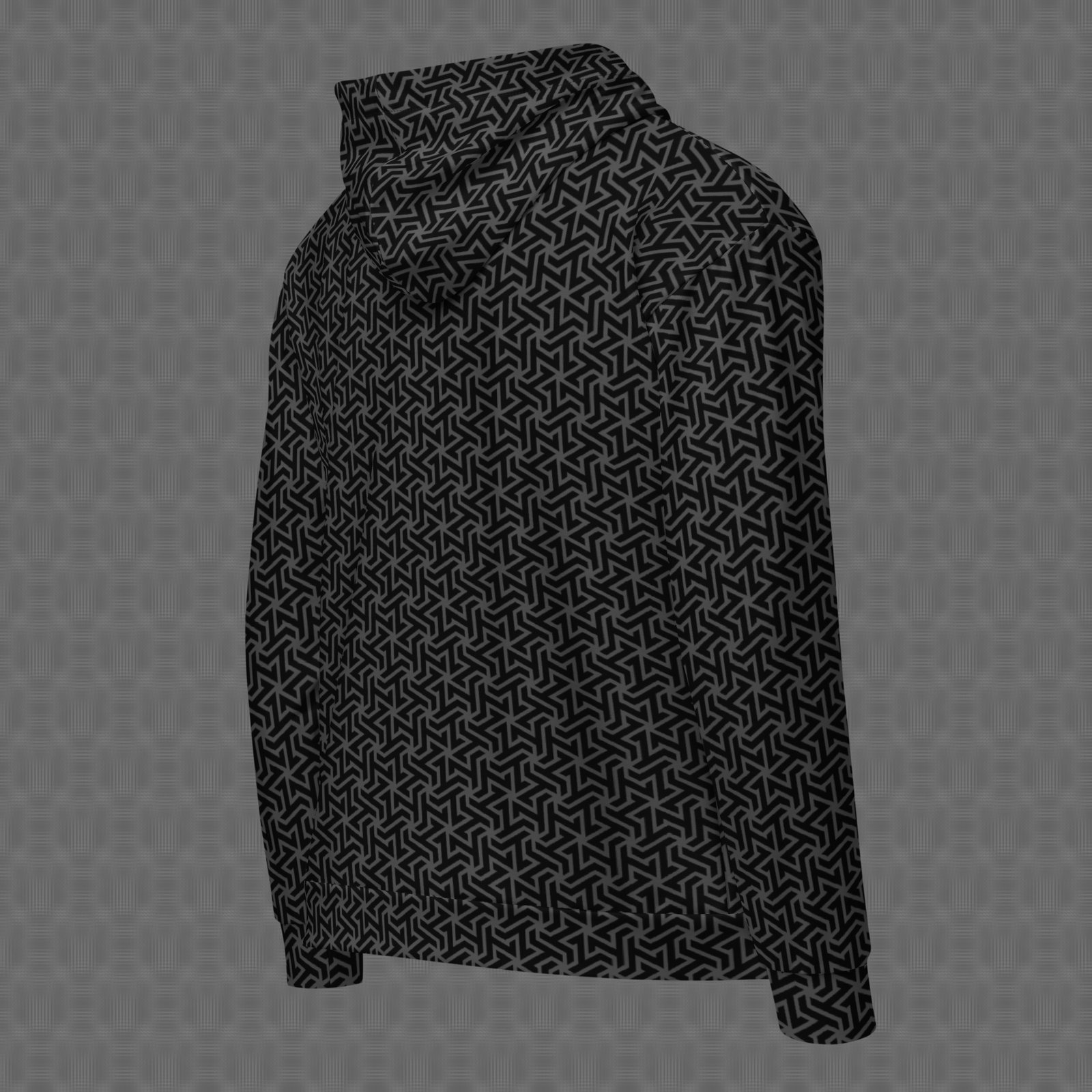 The Frequencies Resonate all-over zip hoodie features a black and gray dense, repeating geometric pattern of interlocking angular forms, creating a subtle optical rhythm that feels structured, hypnotic, and precise. Under UV and RGB lighting environments, the colors shift, glow, and transform, bringing the artwork to life in immersive settings, making it ideal for sound-system culture, minimal psychedelic environments, and spaces centered on rhythm, repetition, and the visual expression of frequency.