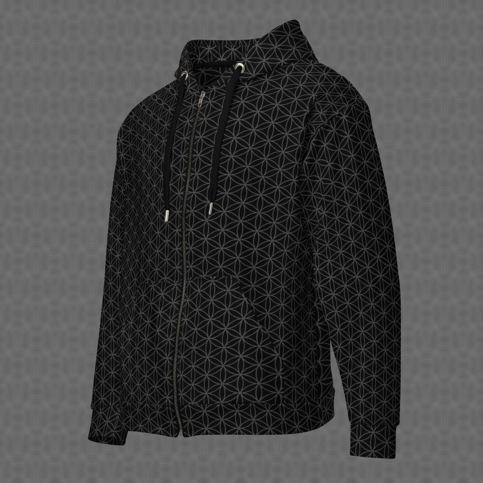 The Frequencies Seed all-over zip hoodie features a precise black on gray triangular lattice forming repeating tetrahedral geometry, creating a structured, harmonic pattern rooted in sacred form. Under UV and RGB lighting environments, the colors shift, glow, and transform, bringing the artwork to life in immersive settings, making it ideal for sacred geometry gatherings, harmonic meditation environments, and spaces focused on structural resonance, geometric order, and the visual language of form.