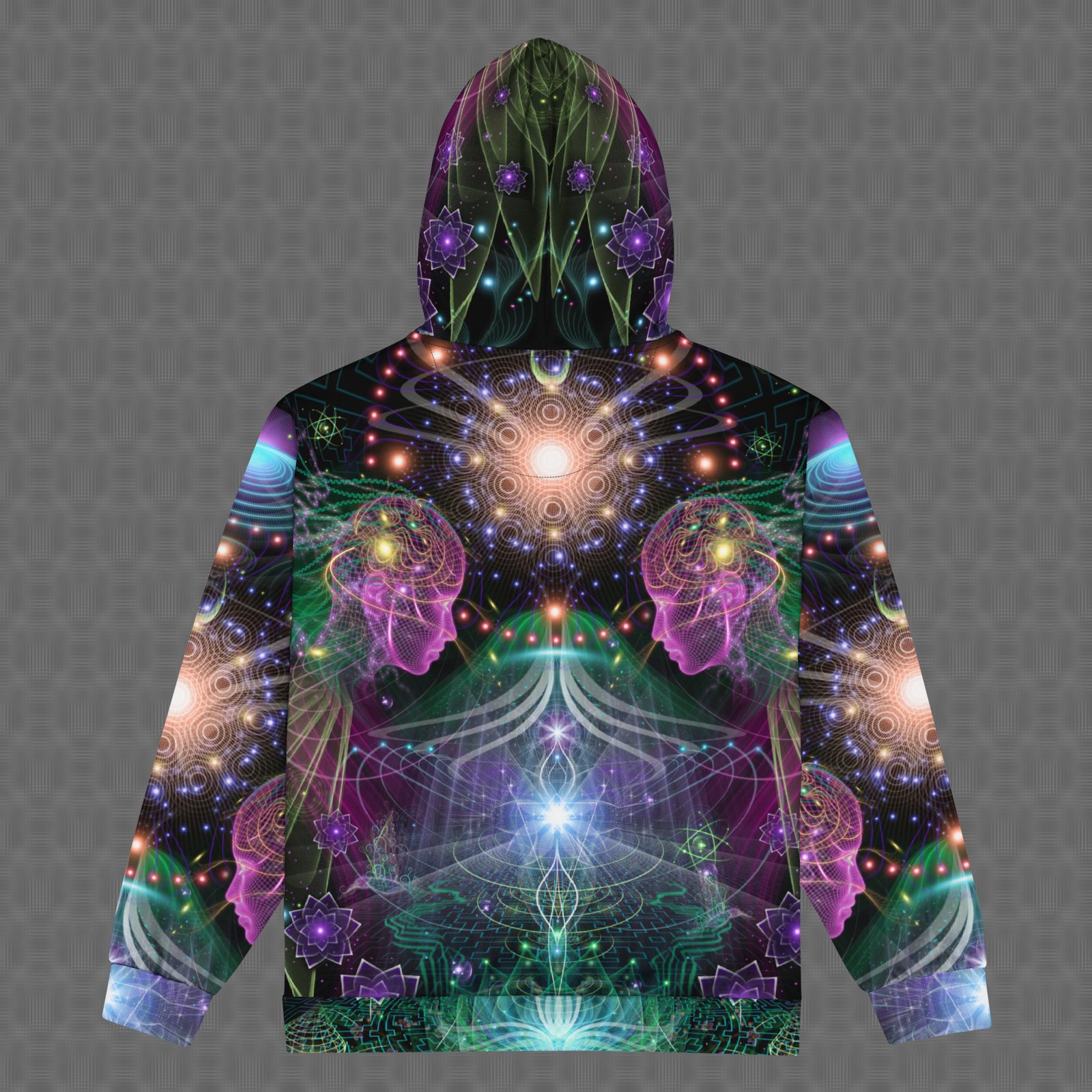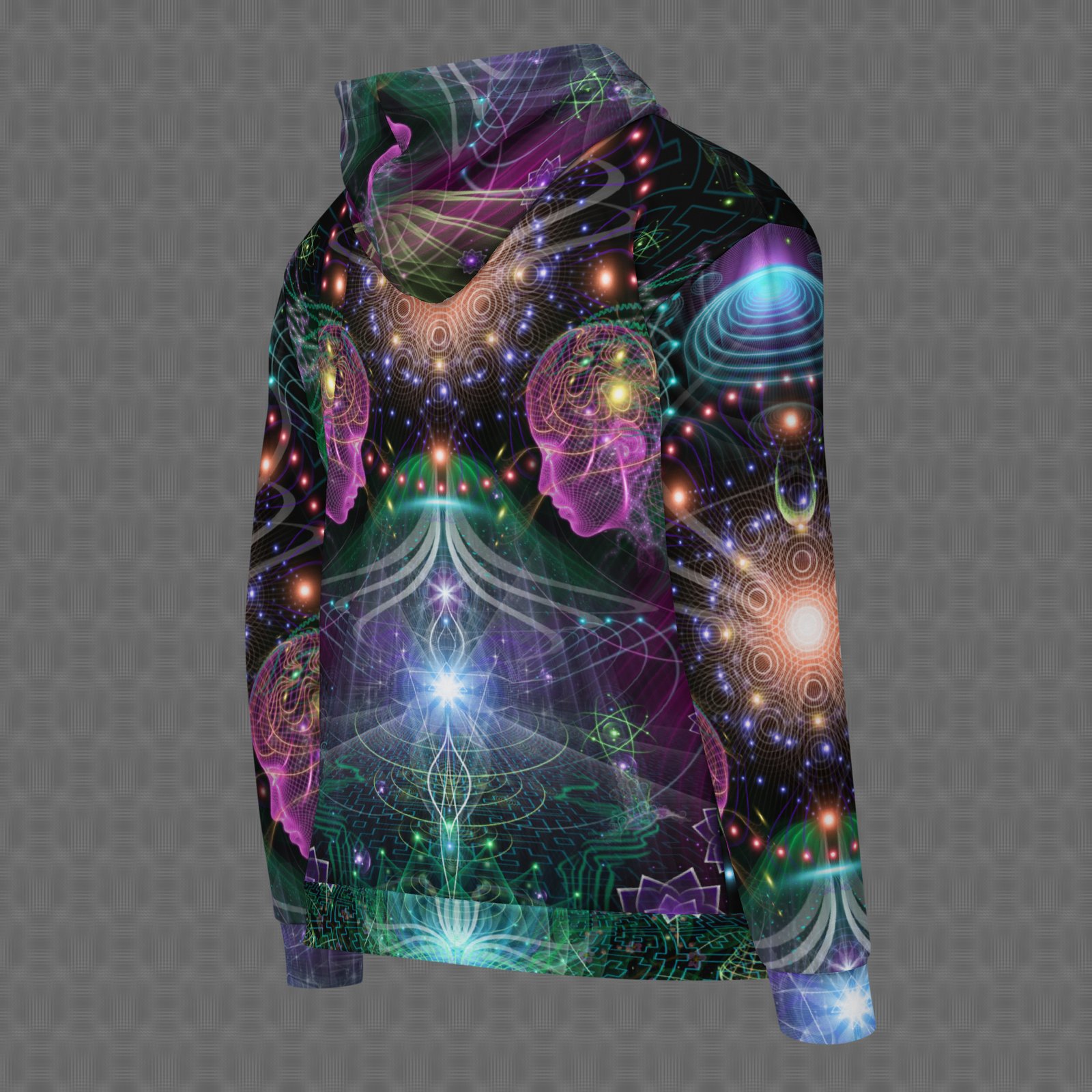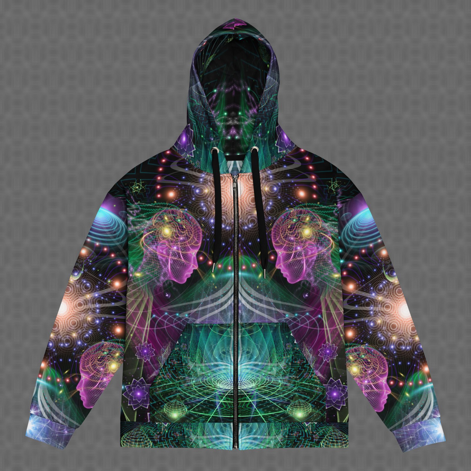 The Holobloom all-over zip hoodie features a vivid psychedelic print with a magenta, orange, and blue visionary pattern, resembling an enchanted cosmic aesthetic. Under UV and RGB lighting environments, the colors shift, glow, and transform, bringing the artwork to life in immersive settings, making it ideal for night-time festivals, luminous urban environments, and psychedelic gatherings where color, motion, and light-driven aesthetics take center stage.
