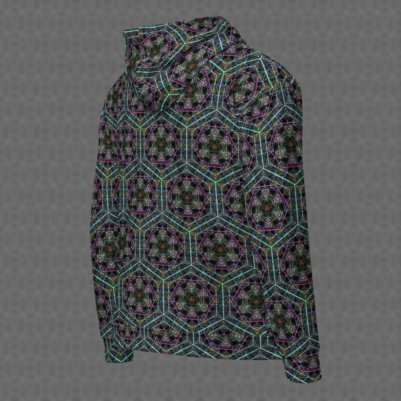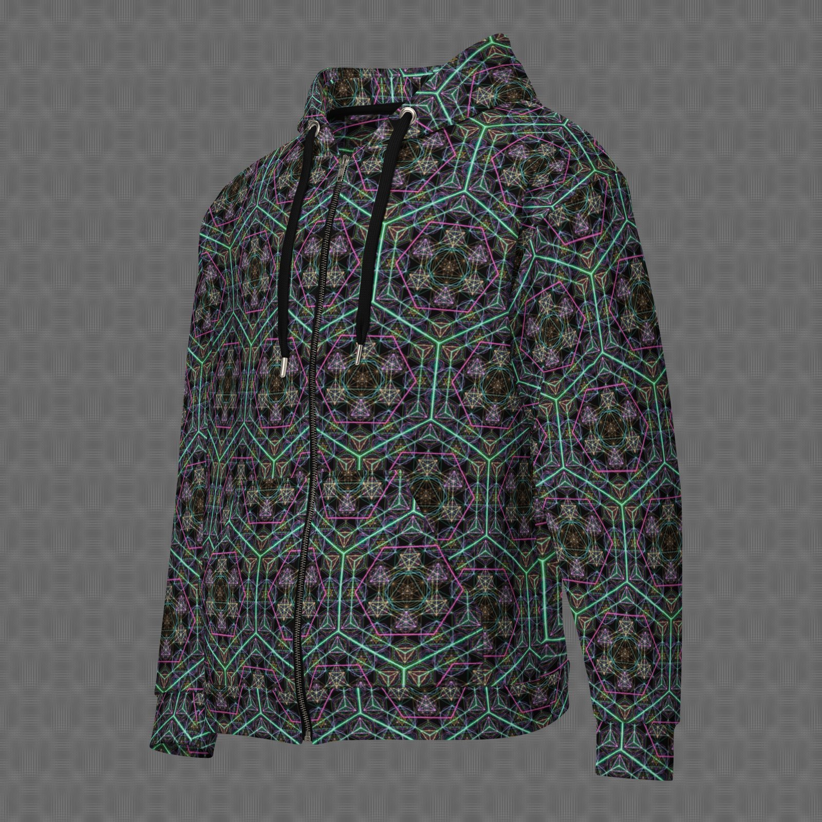 The Hypergeometry all-over zip hoodie presents an intricate mulit-colored lattice of platonic solids, where neon-lined geometry folds into itself to evoke higher-dimensional symmetry and infinite recursion. Under UV and RGB lighting environments, the colors shift, glow, and transform, bringing the artwork to life in immersive settings, making it ideal for psychedelic fashion lovers, festival and concert wear, visionary streetwear styling, immersive art environments, and those drawn to sacred geometry and UV-reactive design.