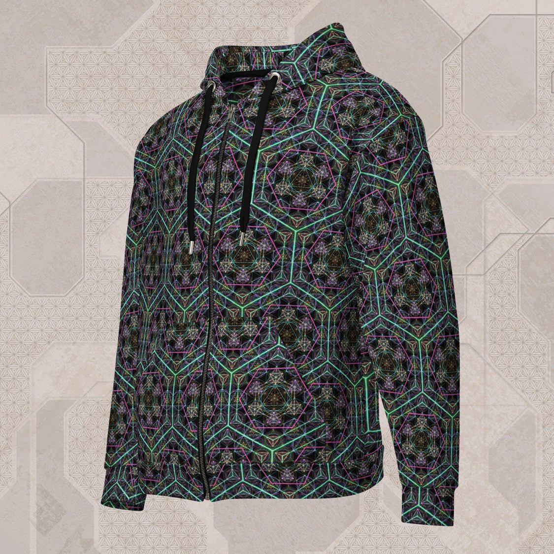 The Hypergeometry Zip Hoodie connects you to the network of life and lights up your senses with neon symmetry. Its sacred geometry pattern adds balance and flow to your everyday look.