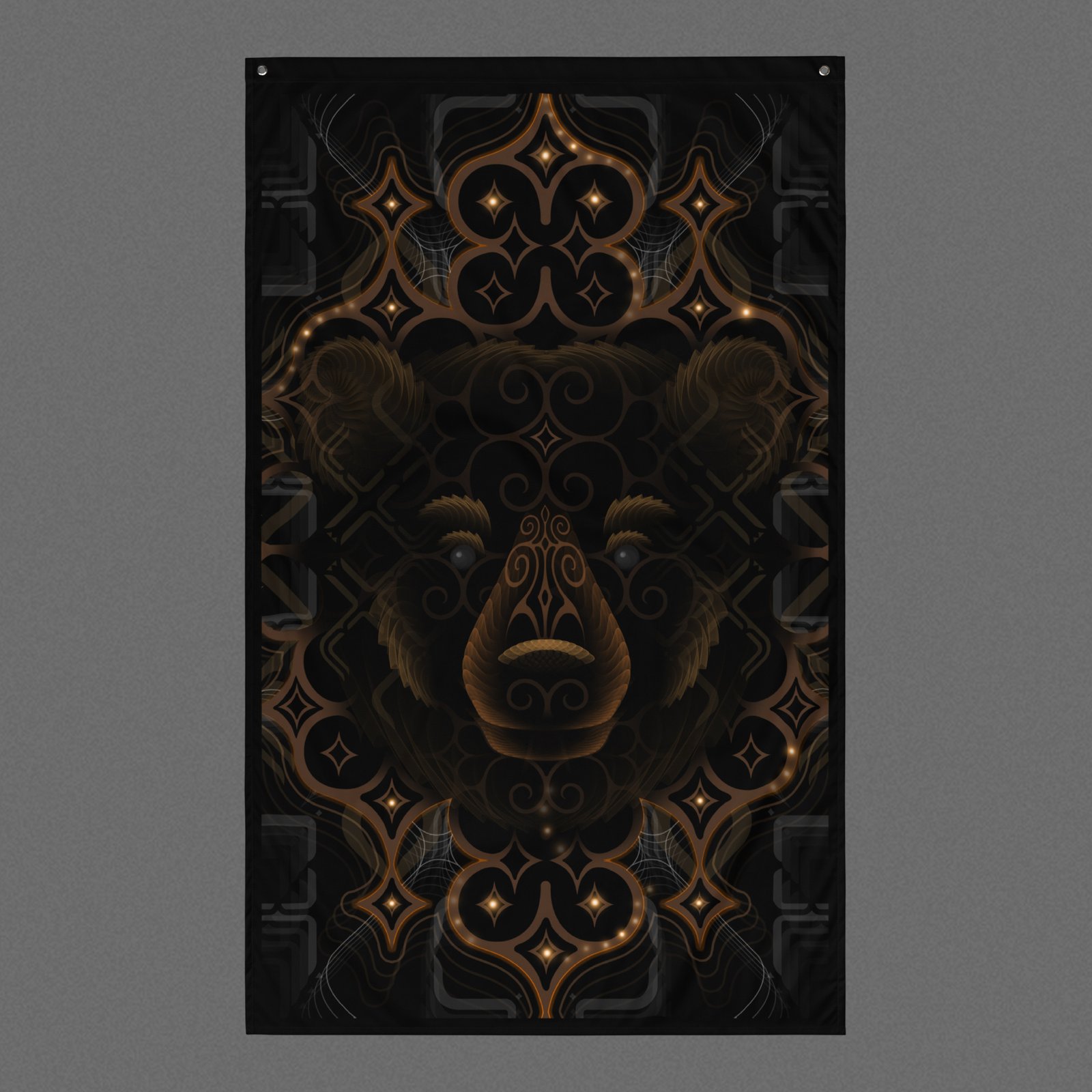 - Depicts a close-up bear spirit face formed from layered ornamental geometry