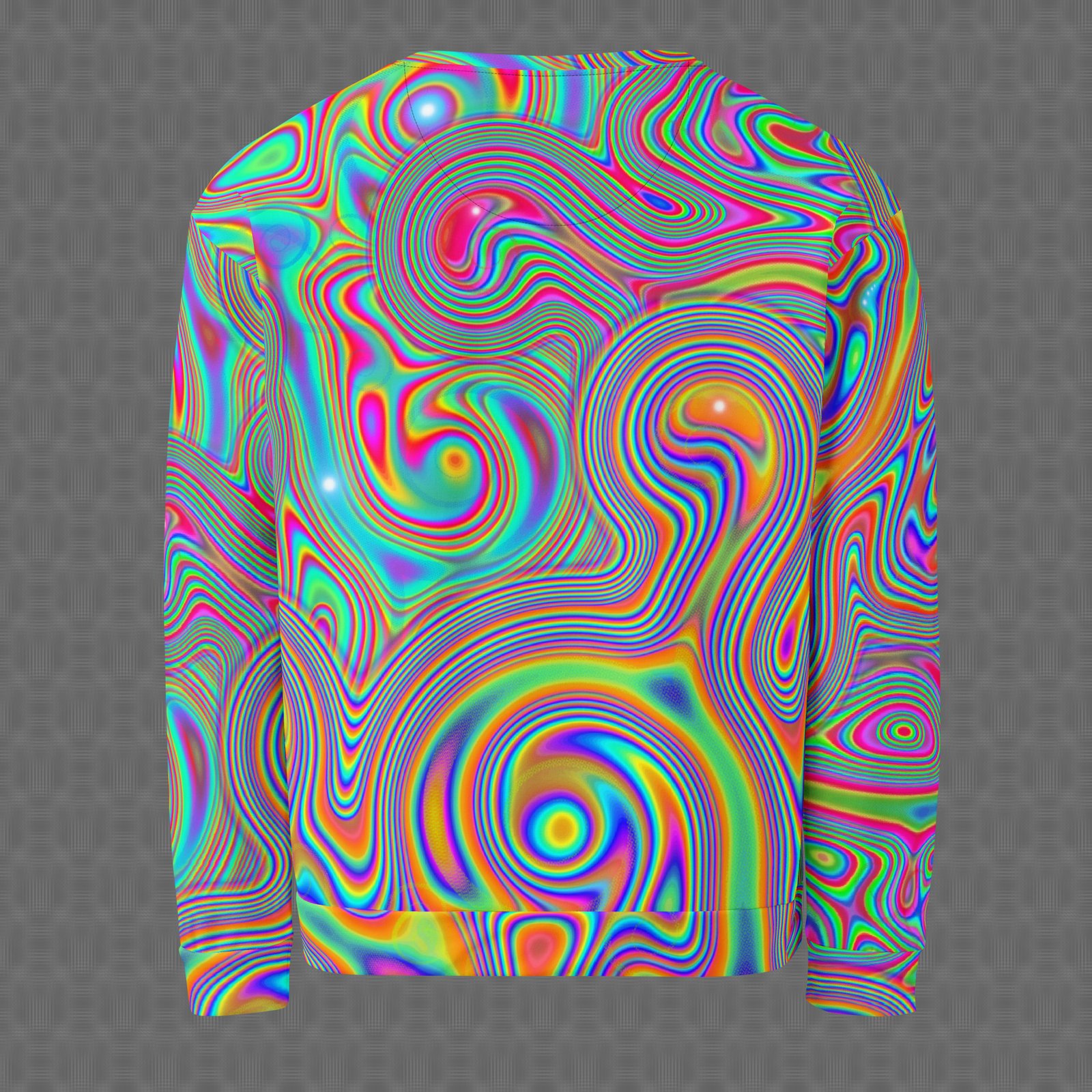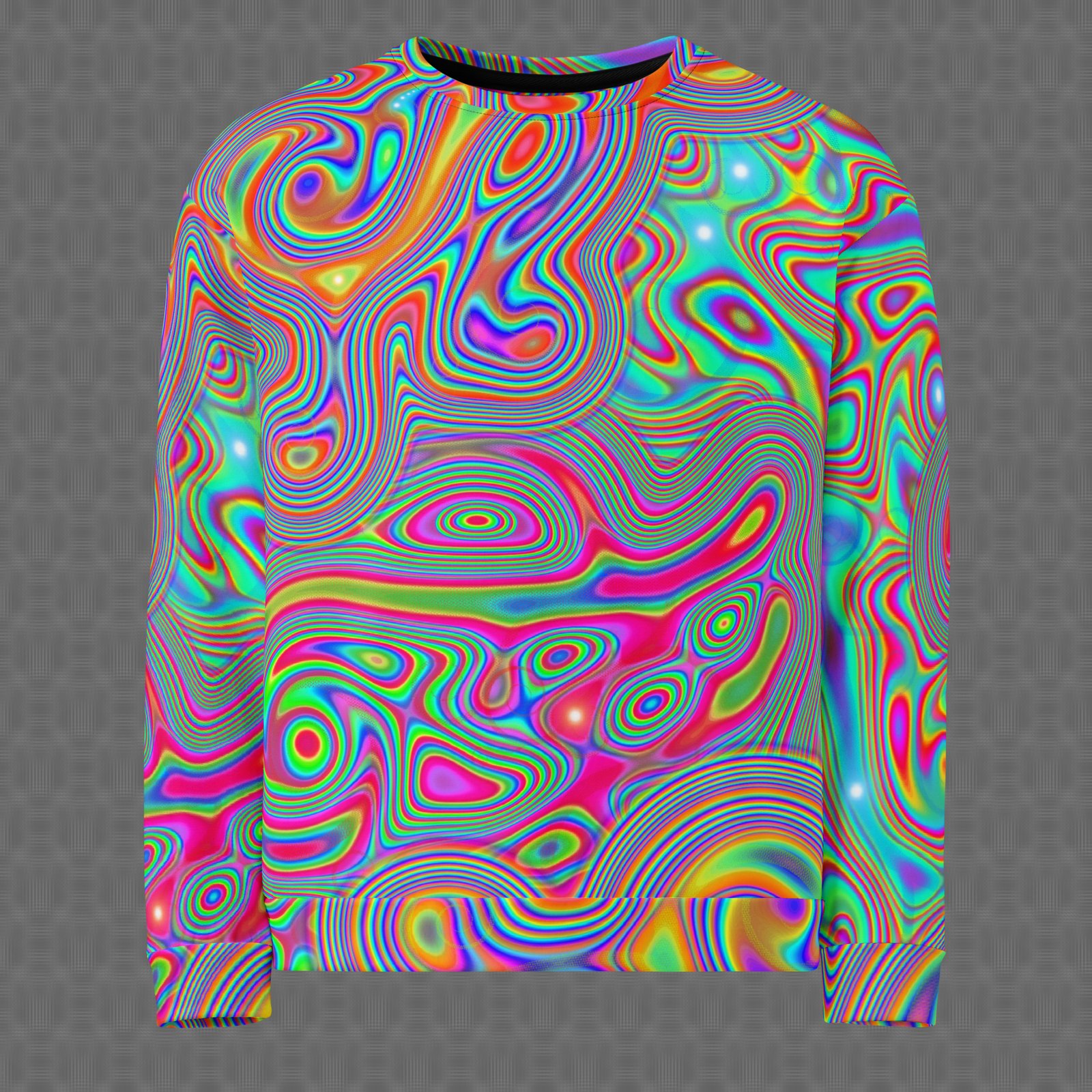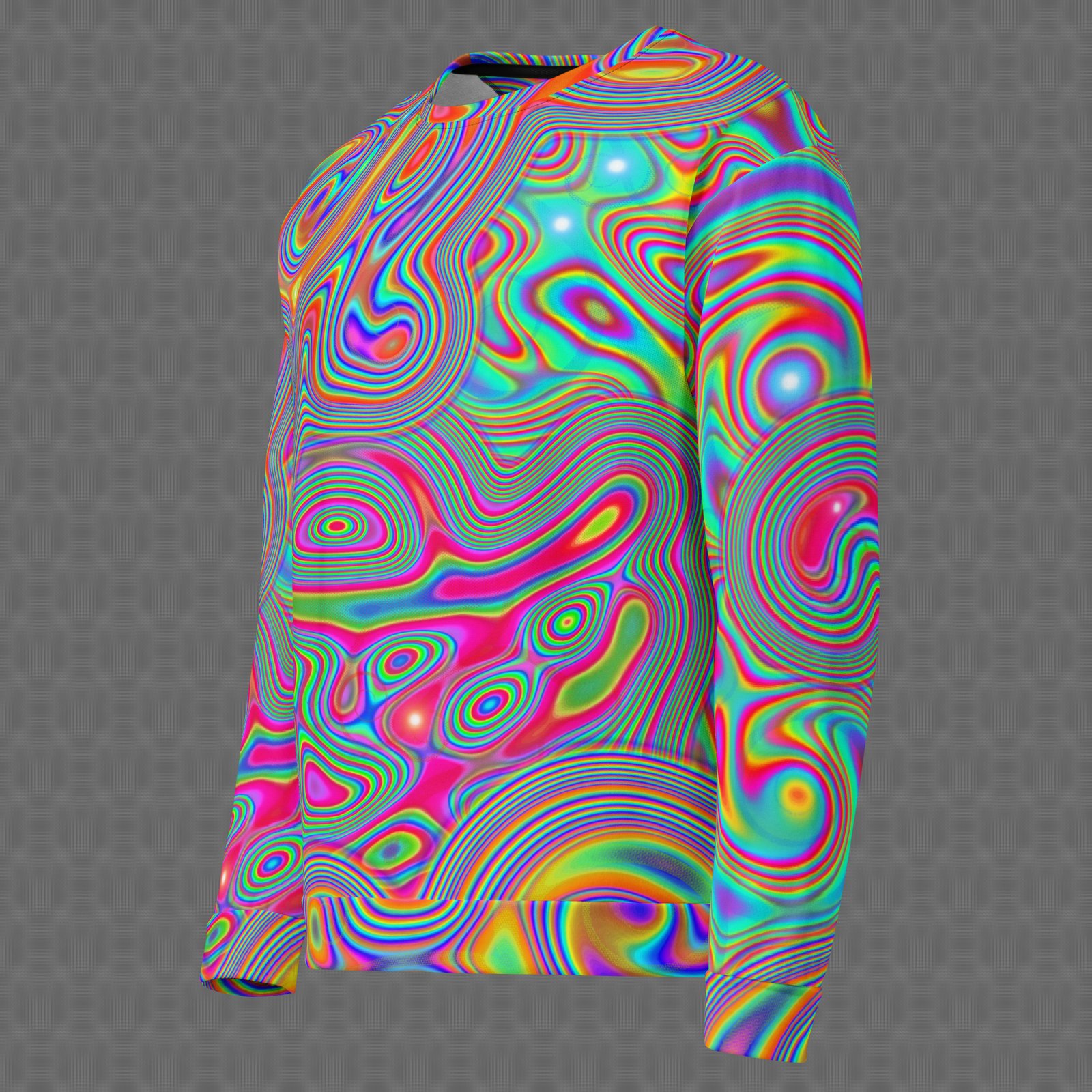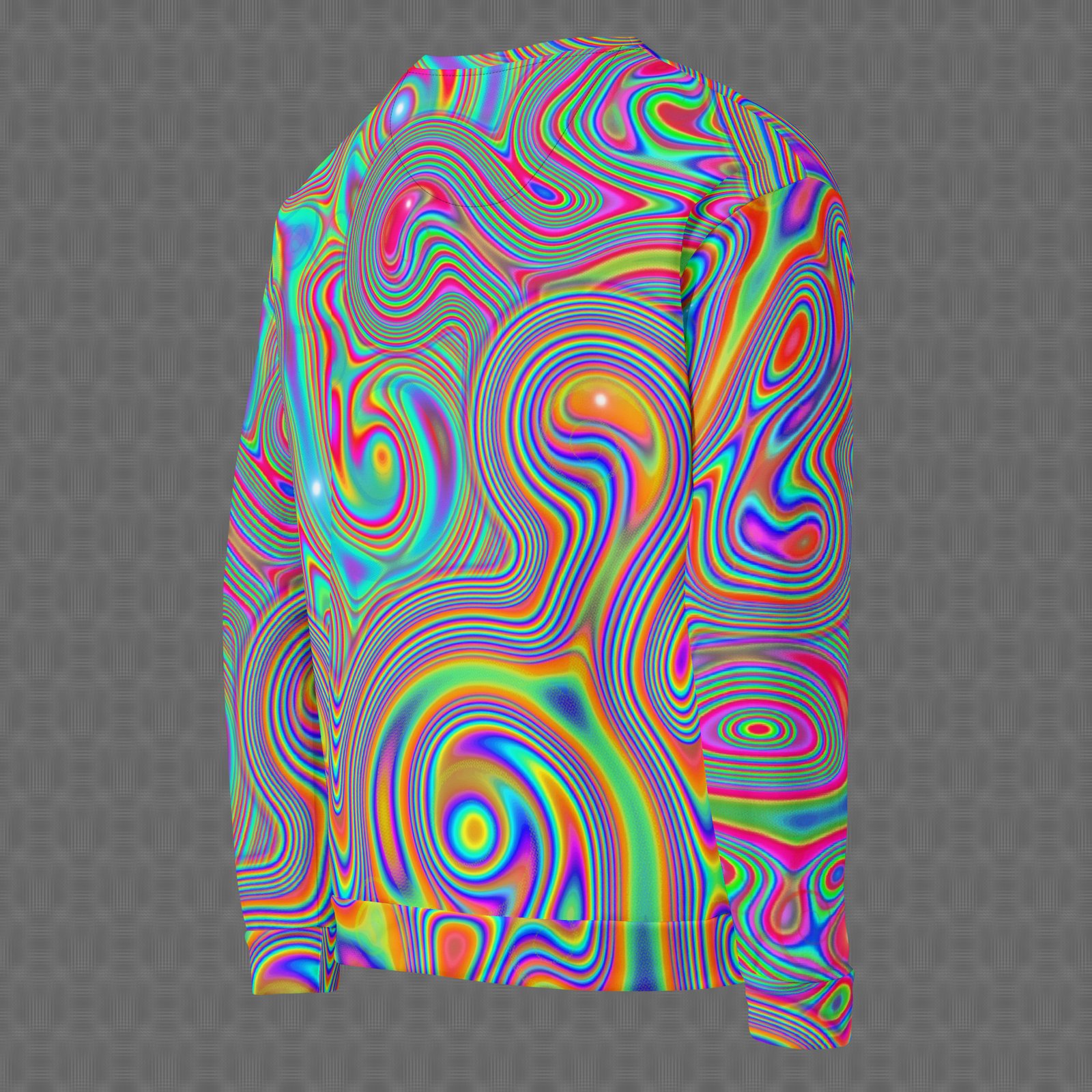 The vibrant, fade-resistant psychedelic print reacts under both RGB and UV light, making it ideal for festivals, chill nights, or everyday wear. Made in the USA from recycled plastic textiles and finished with durable triple-stitching, this is your go-to layer for comfort, color, and conscious design.