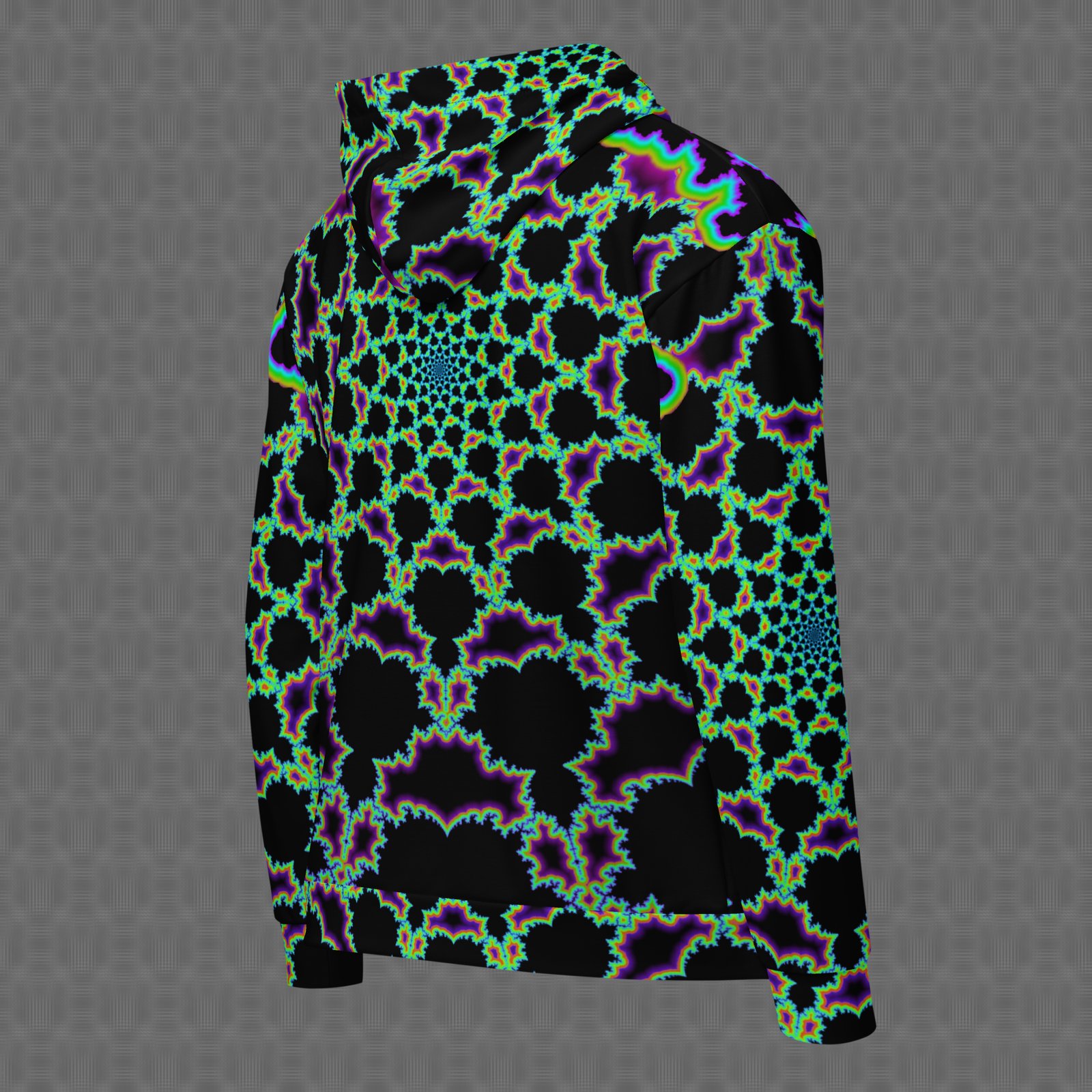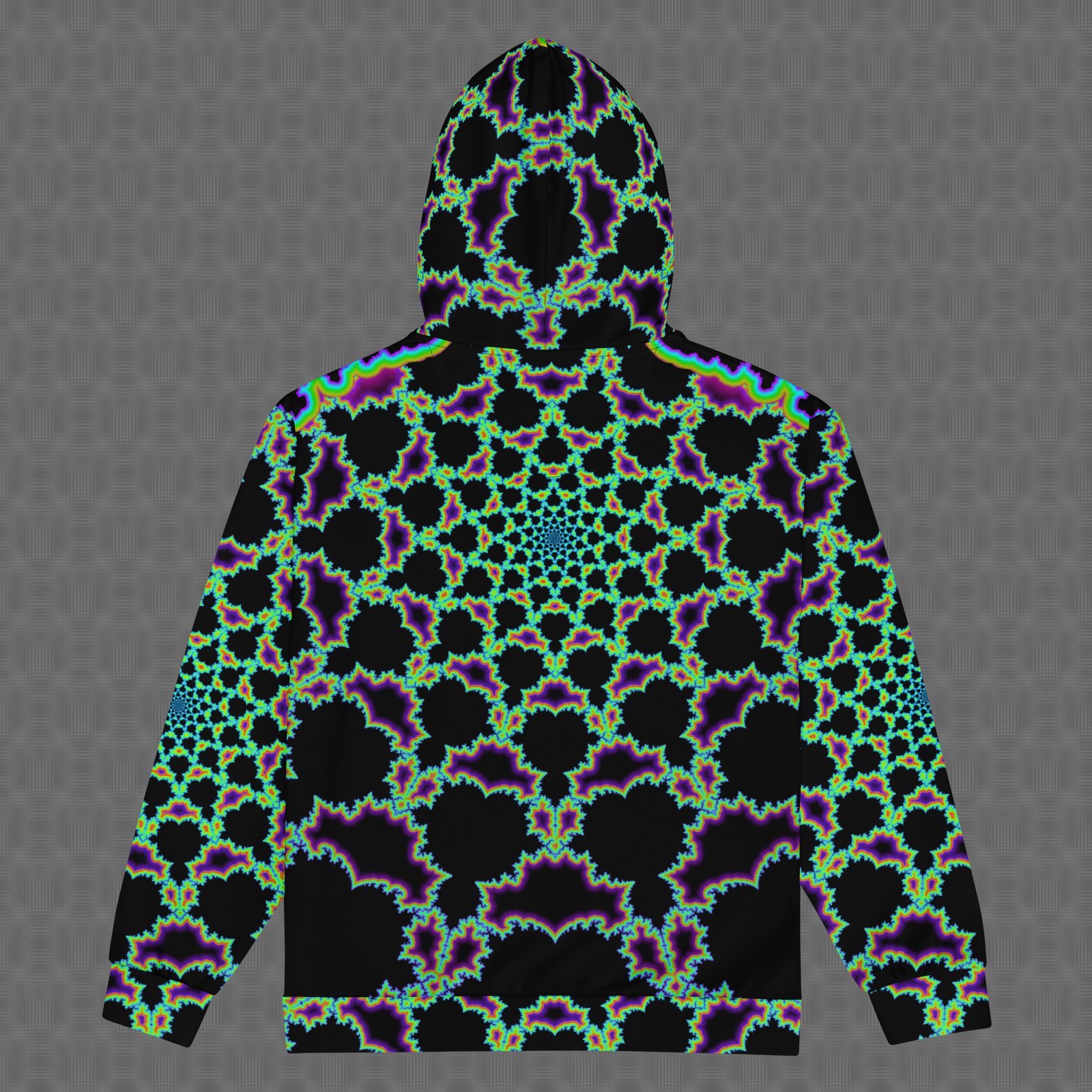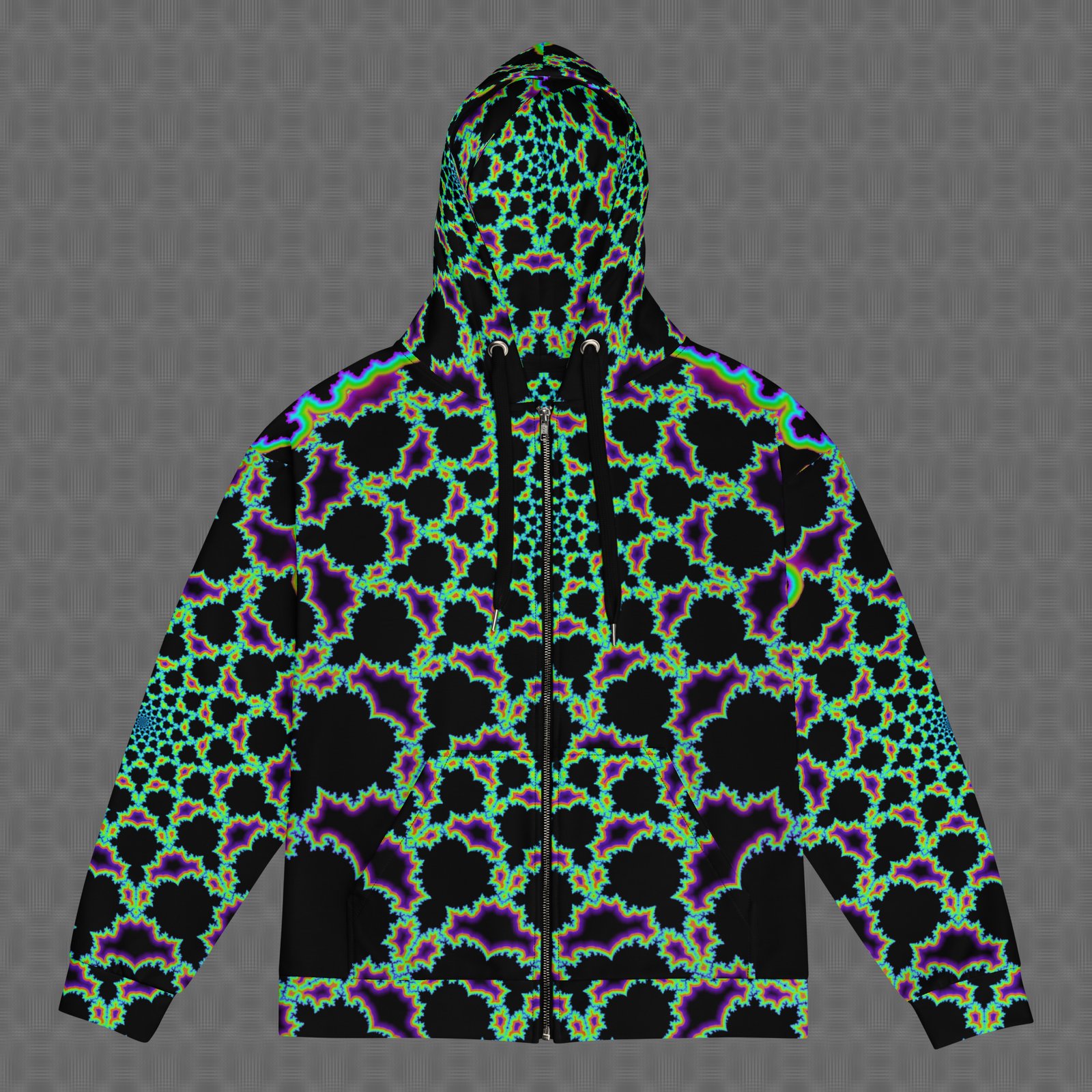 The Mandelblot all-over zip hoodie features a vivid psychedelic print with a rainbow on black Mandelbrot fractal pattern spiraling out into a mandala, resembling oscillating Buddha-like silhouettes. Under UV and RGB lighting environments, the colors shift, glow, and transform, bringing the artwork to life in immersive settings, making it ideal for contemplative psychedelic spaces, fractal-inspired gatherings, and immersive environments where geometry, repetition, and consciousness exploration intersect.