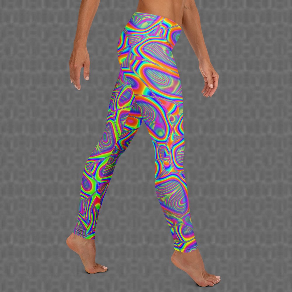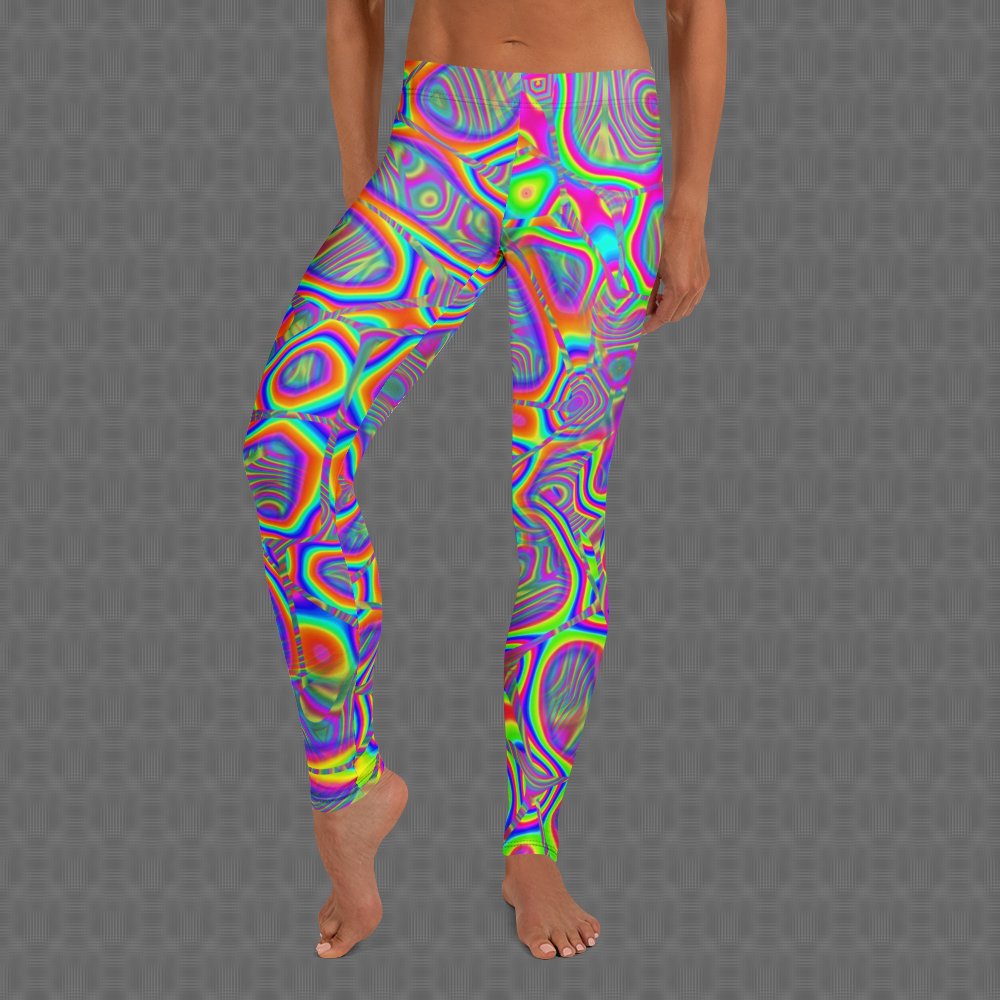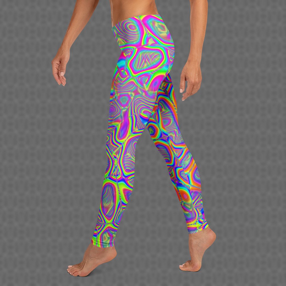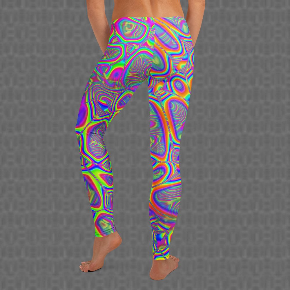 The UV-reactive, fade-resistant psychedelic print glows under blacklight and stays vibrant over time. Designed with an elastic waistband and triple-stitched seams for lasting durability, they also feature UPF 50+ sun protection. Sustainably made from recycled textiles, these leggings deliver high-performance comfort with bold visual impact.