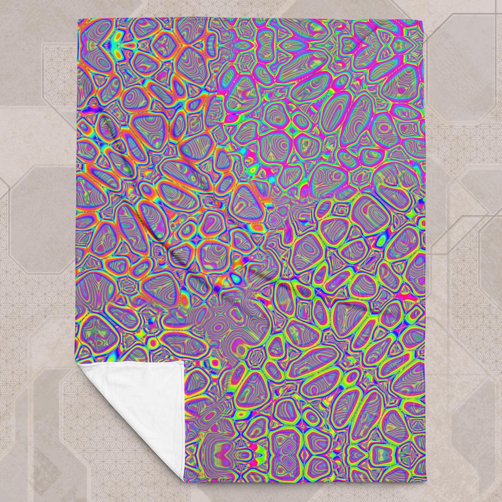 Whether you’re curled up at home, traveling, or spreading it out at a festival, this soft plush blanket is your go-to companion. Large enough to cover one person in cozy comfort or spacious enough to share, it also doubles as a protective ground covering for groups. Its UV/RGB light-reactive surface makes it an essential for music festivals, glowing vividly under blacklight. Crafted from recycled material, this eco-conscious blanket doesn’t just look good—it does good. Vibrant, durable, and fade-proof, this blanket is made for adventures that last a lifetime. Measures 57×77″
