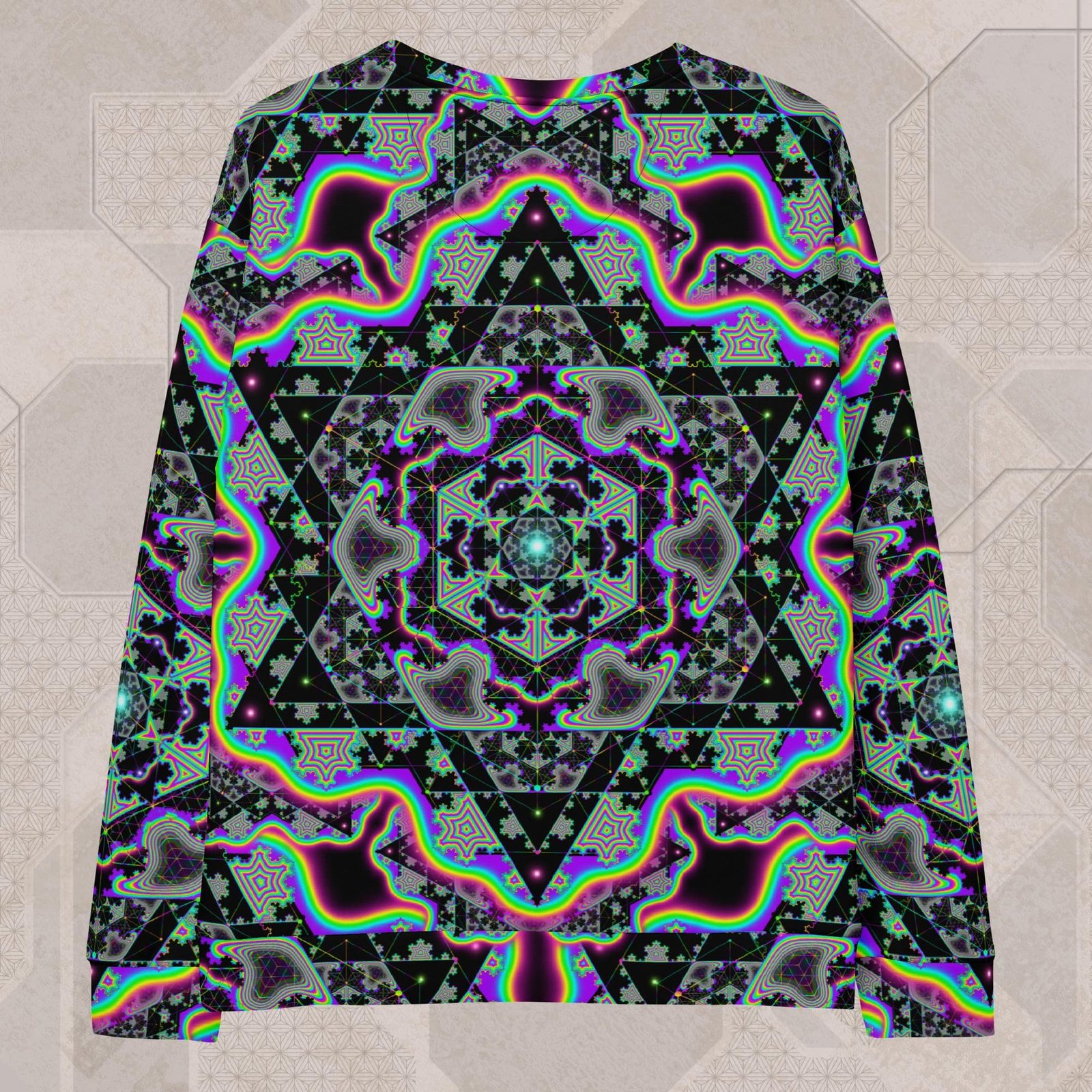 The vibrant, fade-resistant psychedelic print reacts under both RGB and UV light, making it ideal for festivals, chill nights, or everyday wear. Made in the USA from recycled plastic textiles and finished with durable triple-stitching, this is your go-to layer for comfort, color, and conscious design.