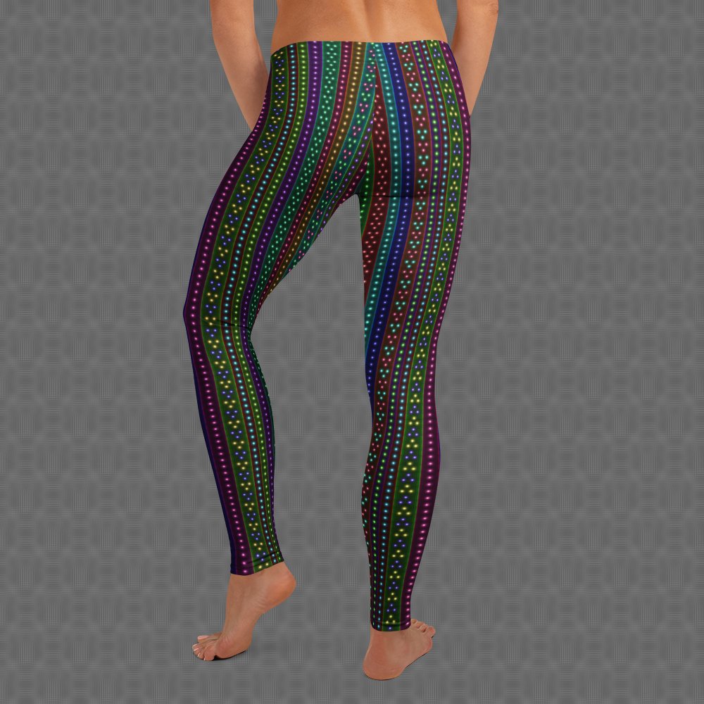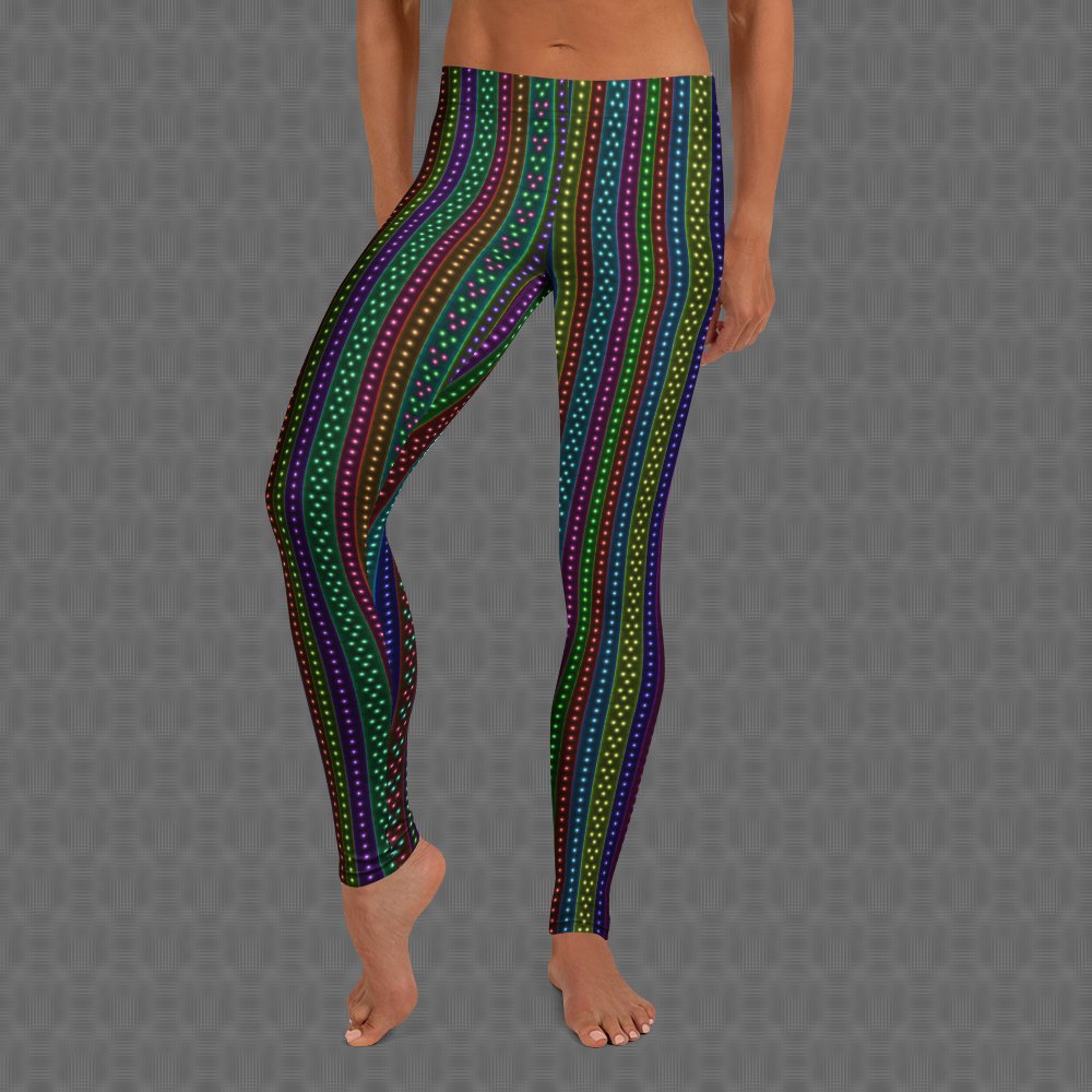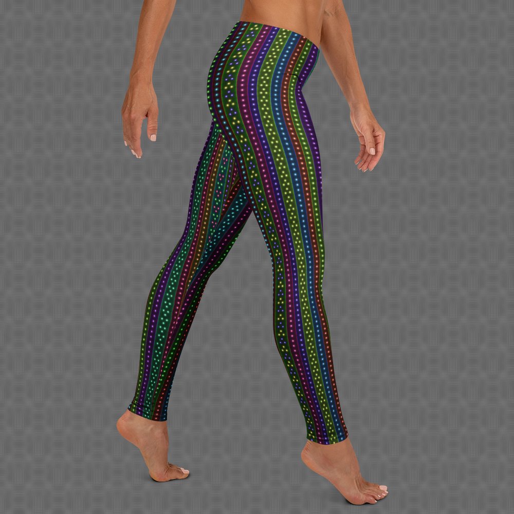 The UV-reactive, fade-resistant psychedelic print glows under blacklight and stays vibrant over time. Designed with an elastic waistband and triple-stitched seams for lasting durability, they also feature UPF 50+ sun protection. Sustainably made from recycled textiles, these leggings deliver high-performance comfort with bold visual impact.