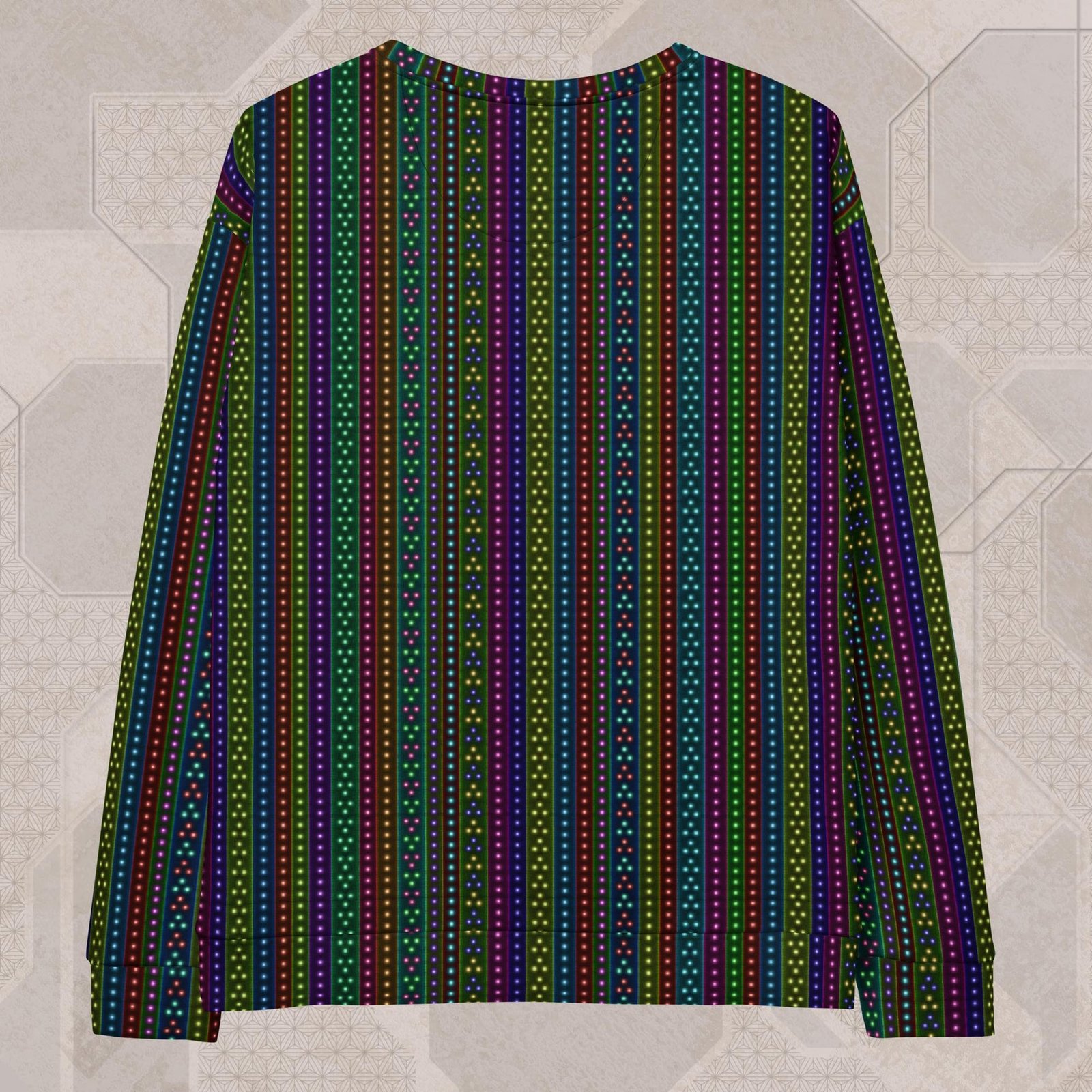 The vibrant, fade-resistant psychedelic print reacts under both RGB and UV light, making it ideal for festivals, chill nights, or everyday wear. Made in the USA from recycled plastic textiles and finished with durable triple-stitching, this is your go-to layer for comfort, color, and conscious design.