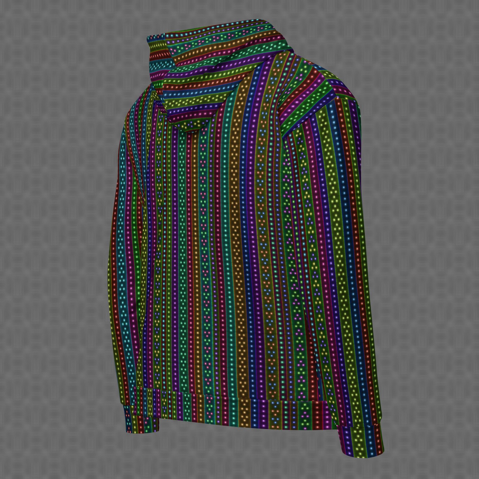 The Modelo all-over zip hoodie channels rhythmic order through vertical strands of glowing multicolor dots, evoking coded light, digital pulse, and ceremonial repetition. Under UV and RGB lighting environments, the colors shift, glow, and transform, bringing the artwork to life in immersive settings, making it ideal for psychedelic streetwear enthusiasts, immersive art and music spaces, festival and concert wear, futuristic everyday styling, and those drawn to rhythmic geometry, coded light, and UV-reactive design.