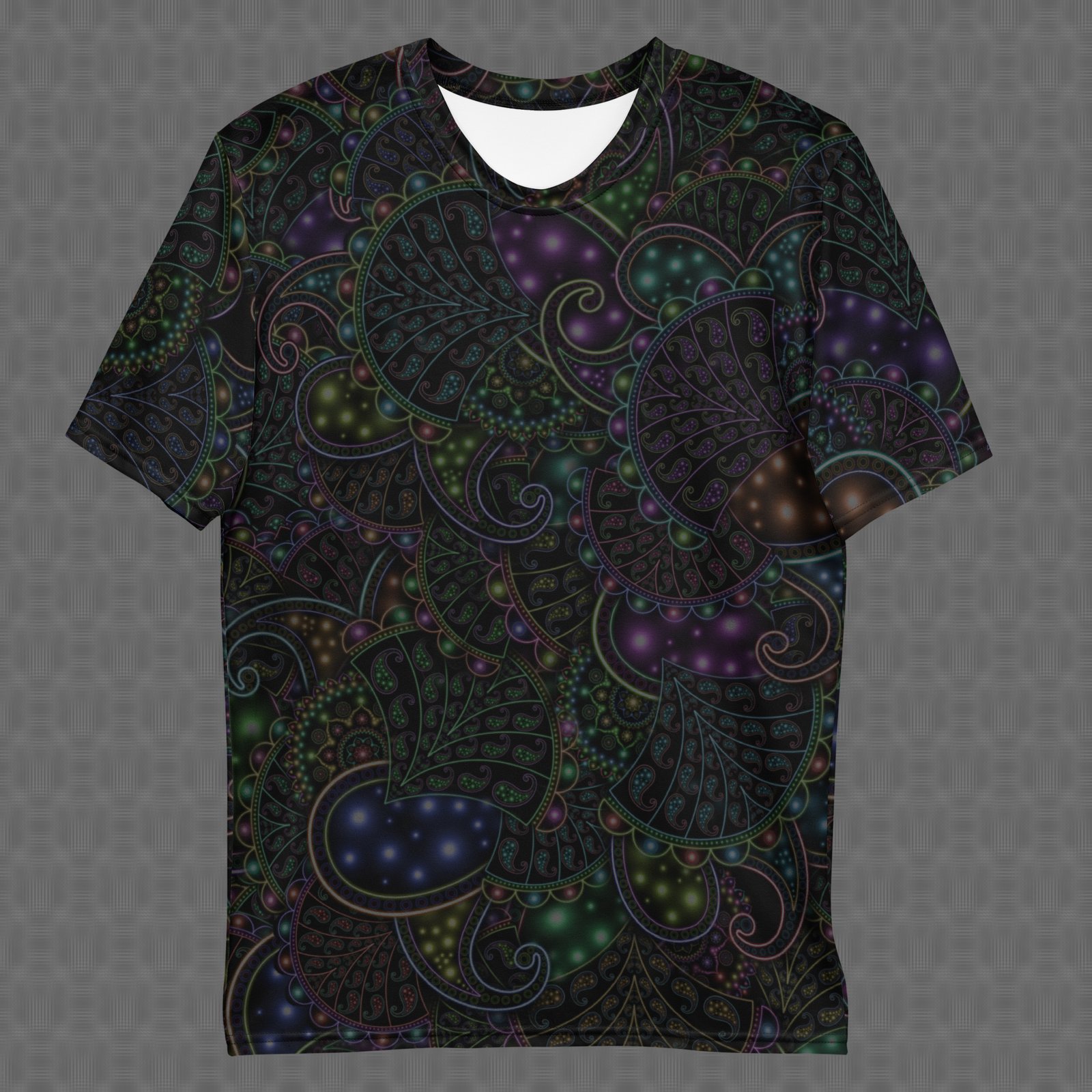 The Neopaisley Dark all-over t-shirt features a dark, intricate paisley composition woven with subtle neon highlights and organic curvature that creates a moody, nocturnal psychedelic pattern. Under UV and RGB lighting environments, the colors shift, glow, and transform, bringing the artwork to life in immersive settings, making it settle into moody visual aesthetics, late-night creative environments, and understated statement wear, and those drawn to dark paisley ornamentation, subtle neon accents, and UV-reactive design.