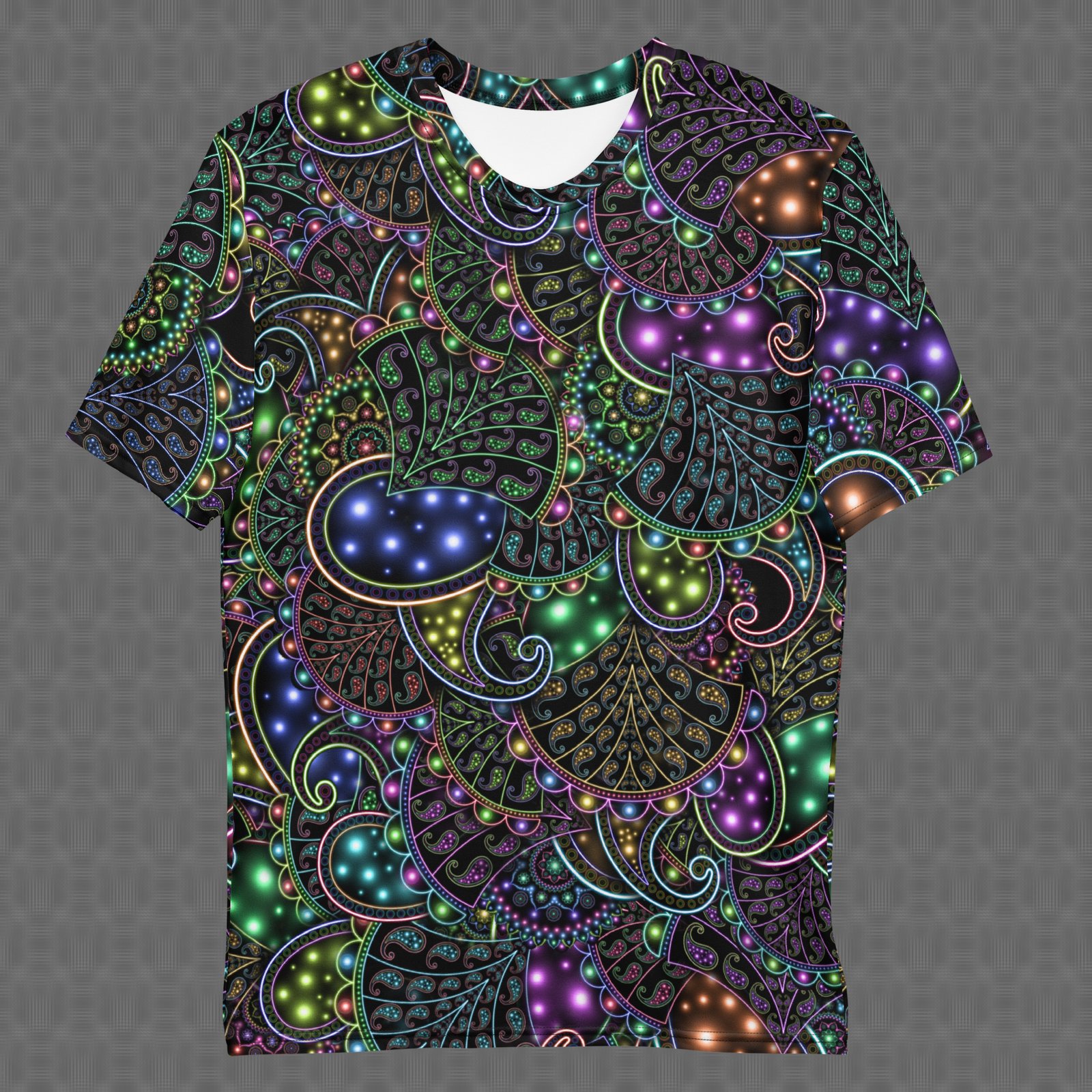 The Neopaisley all-over t-shirt features an intricate, luminous paisley composition woven with glowing orbs and flowing filigree that creates a vibrant psychedelic pattern rich with depth and motion. Under UV and RGB lighting environments, the colors shift, glow, and transform, bringing the artwork to life in immersive settings, making it flow naturally through ornament-rich visual aesthetics, immersive color environments, and expressive statement wear, and those drawn to luminous paisley motifs, intricate filigree, and UV-reactive design.