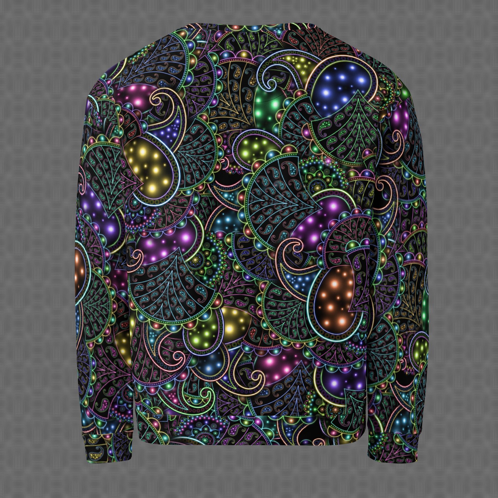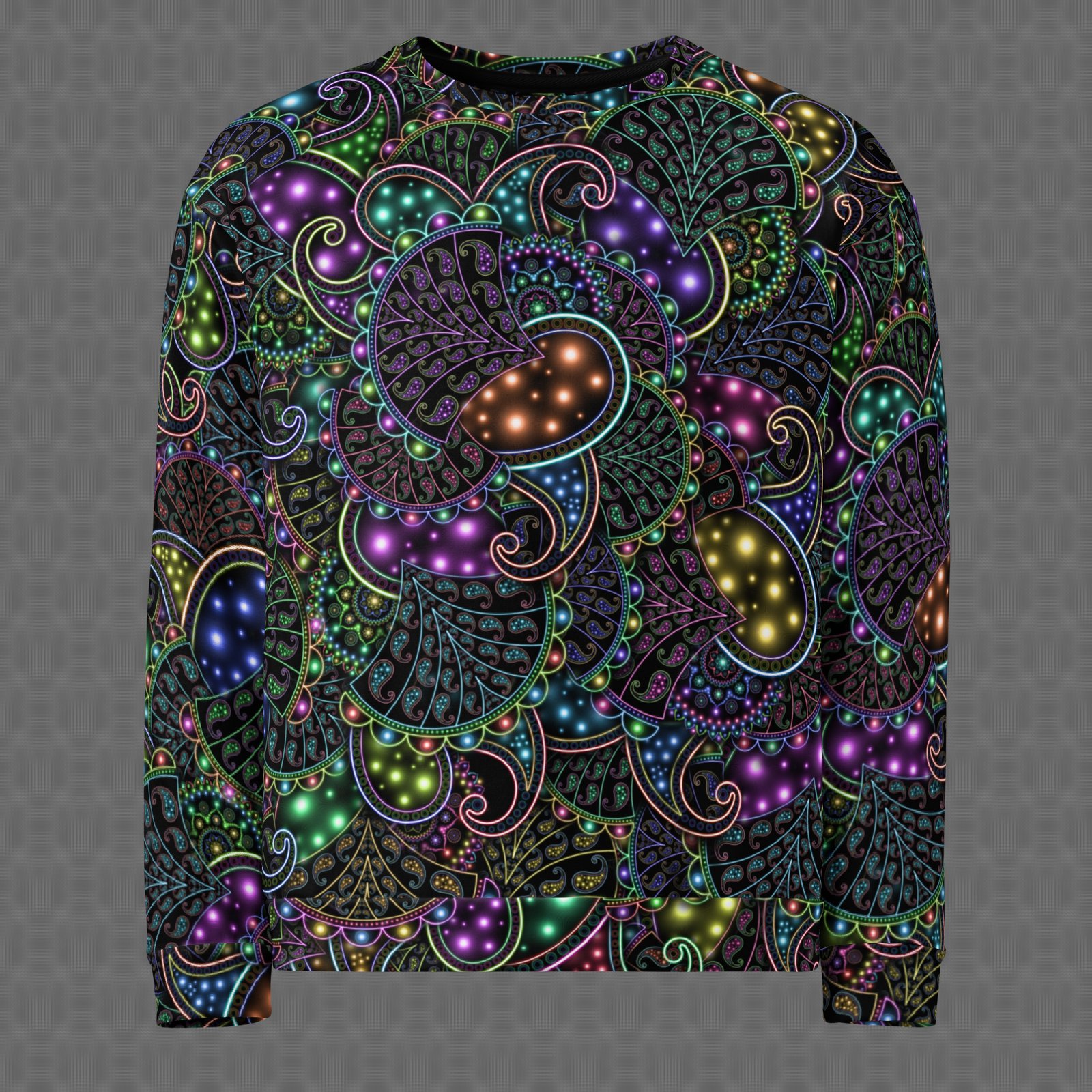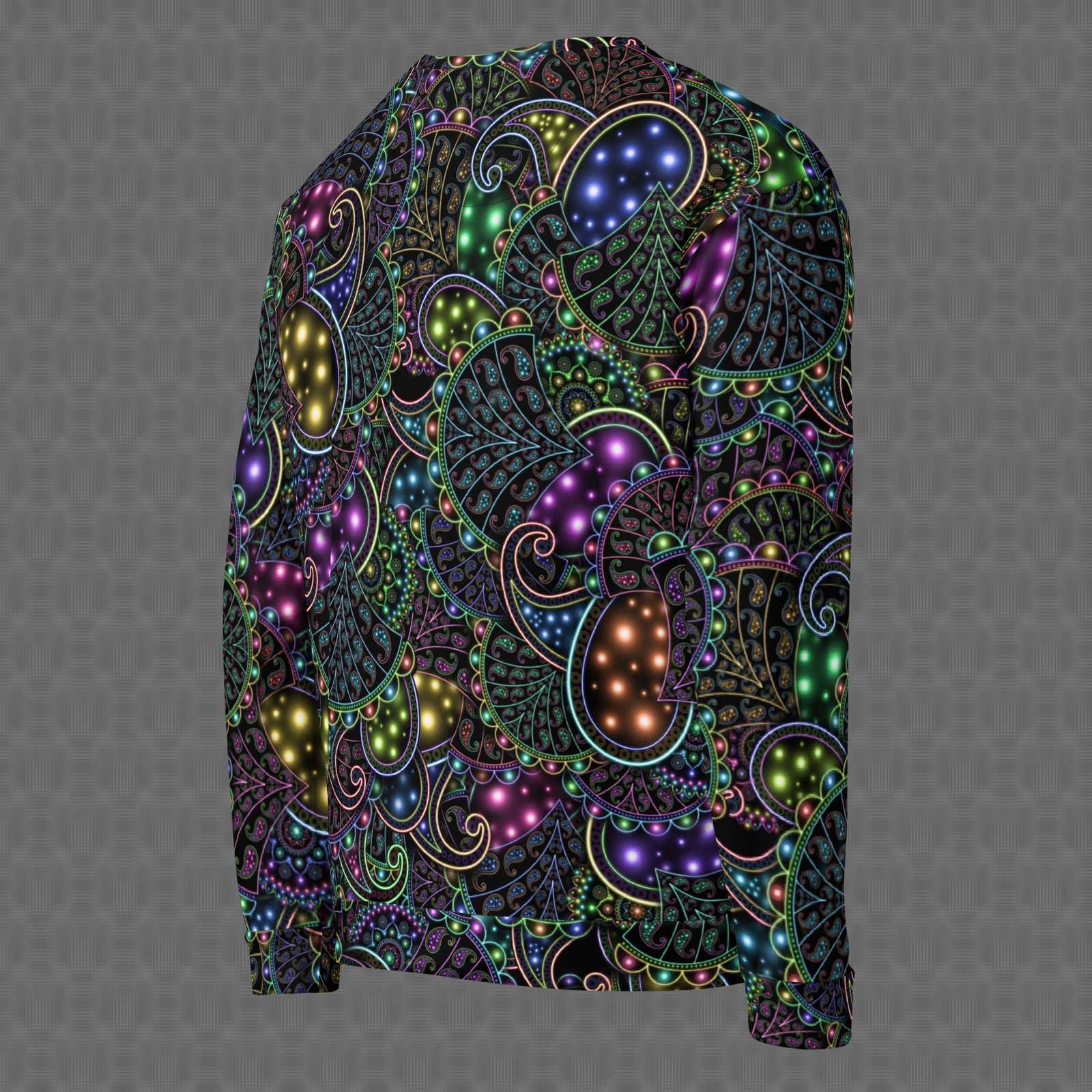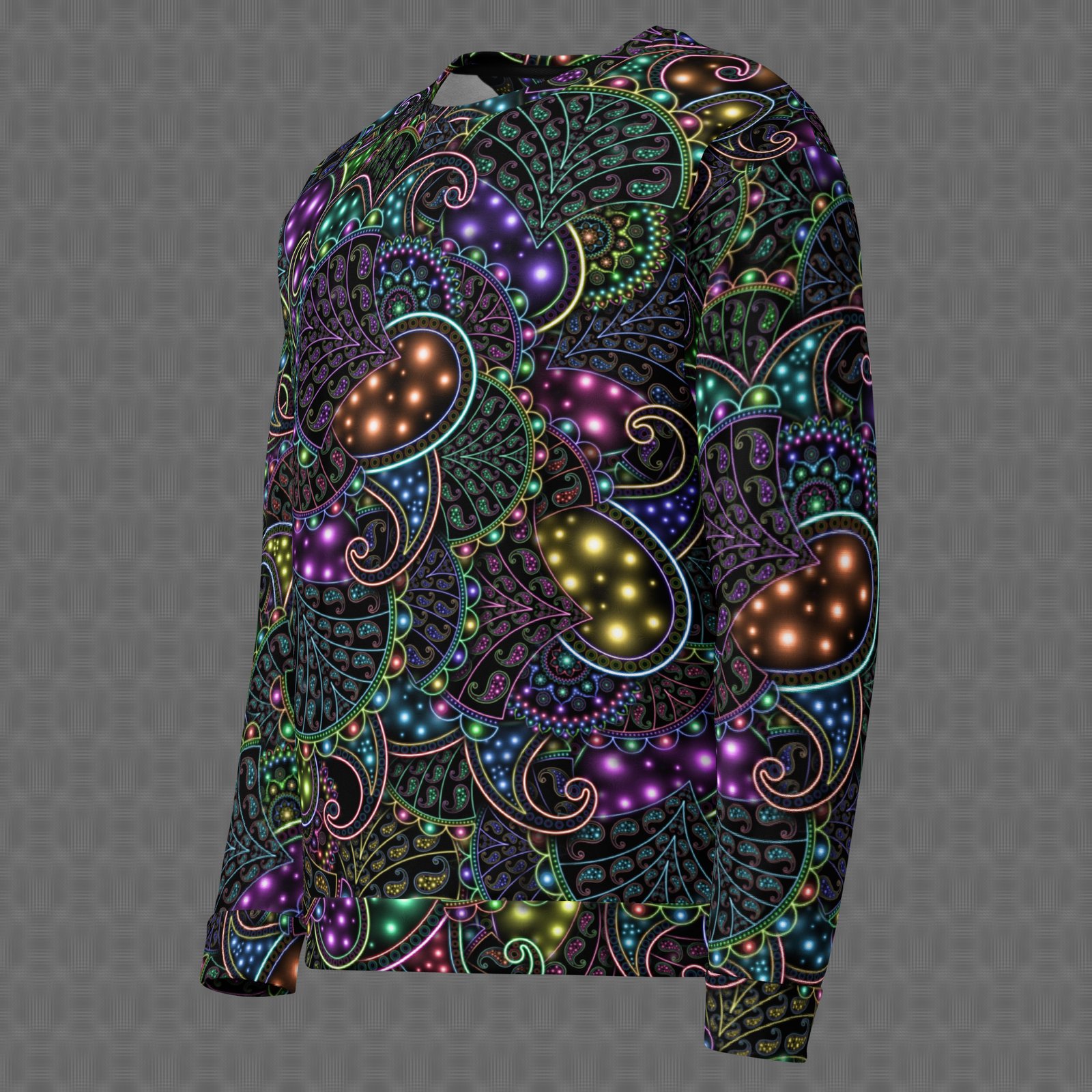 The vibrant, fade-resistant psychedelic print reacts under both RGB and UV light, making it ideal for festivals, chill nights, or everyday wear. Made in the USA from recycled plastic textiles and finished with durable triple-stitching, this is your go-to layer for comfort, color, and conscious design.