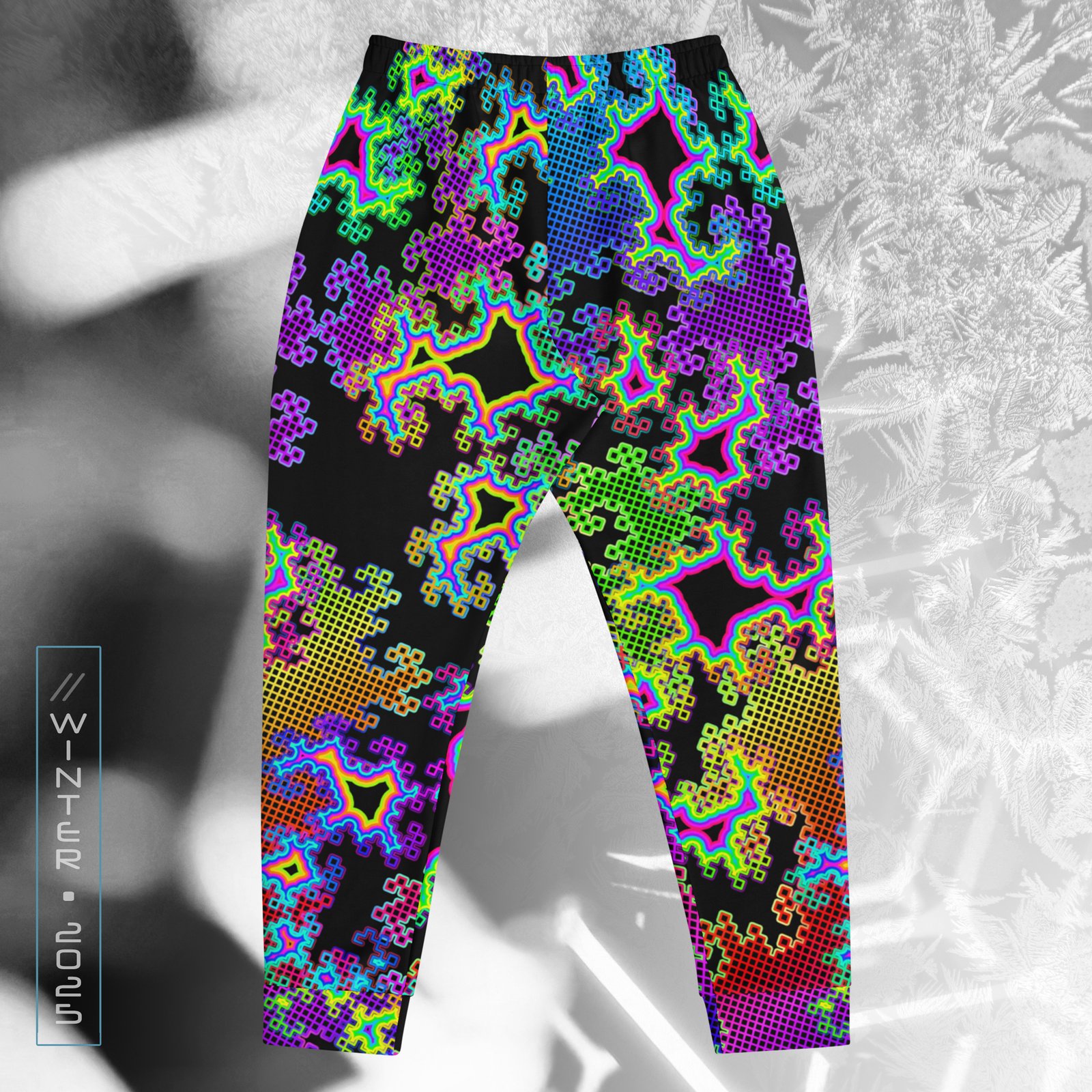 The slim fit and cuffed ankles create a clean, modern silhouette, while deep front pockets and a drawstring waist provide practical, secure comfort. Printed with UV-reactive, fade-resistant color on recycled materials, these joggers are made to move—whether you’re lounging, dancing, or out on the go.