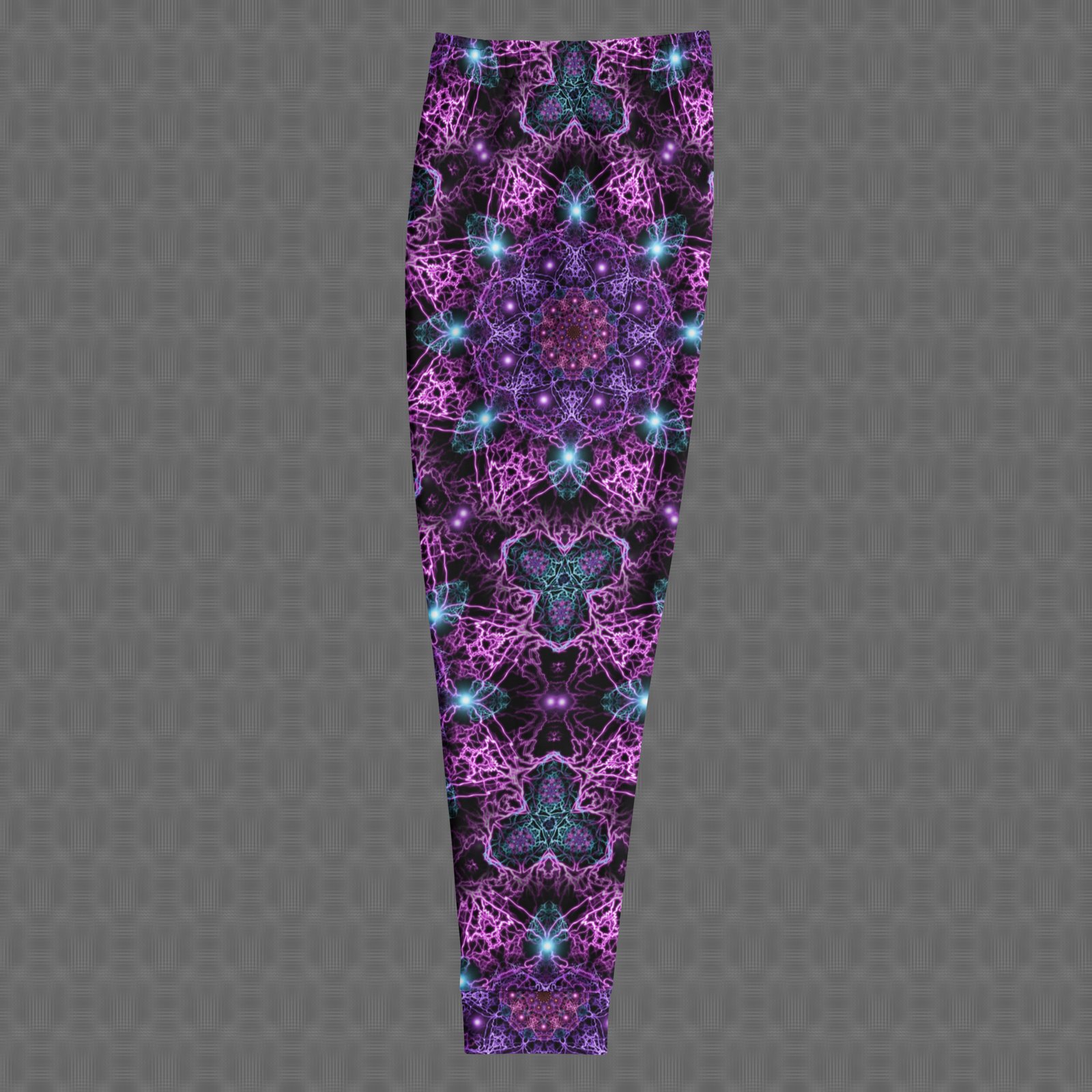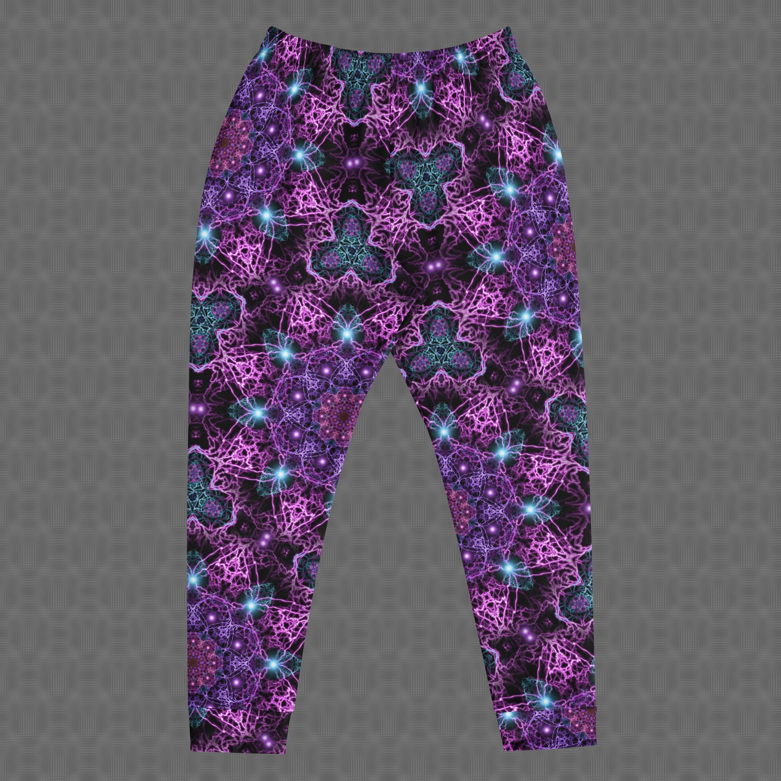 The slim fit and cuffed ankles create a clean, modern silhouette, while deep front pockets and a drawstring waist provide practical, secure comfort. Printed with UV-reactive, fade-resistant color on recycled materials, these joggers are made to moveโwhether you’re lounging, dancing, or out on the go.