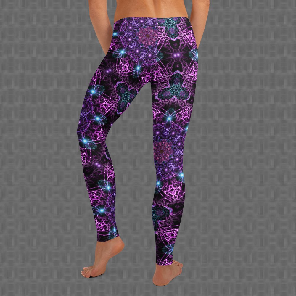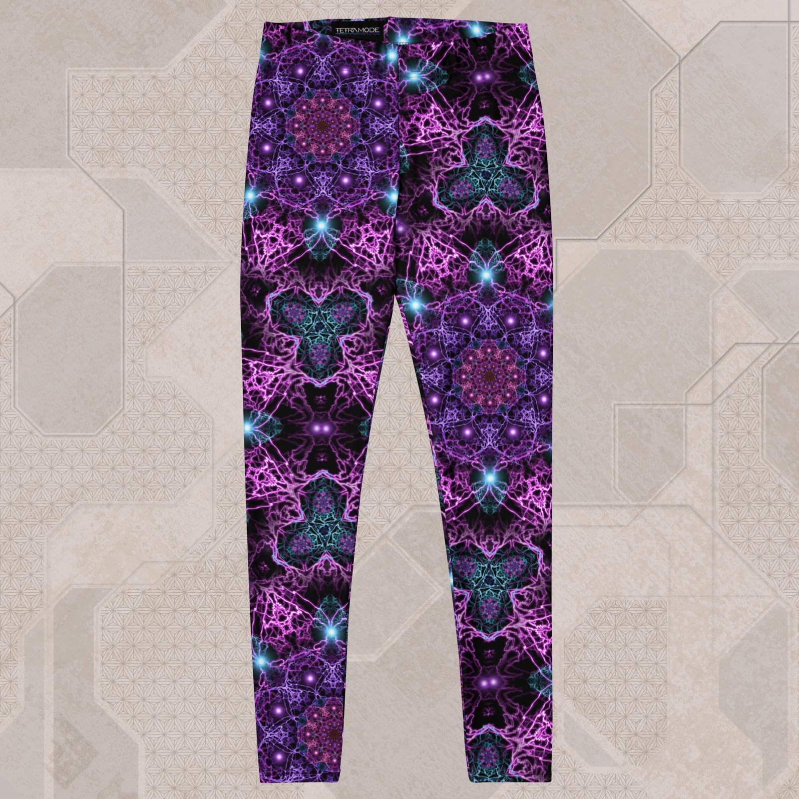 The UV-reactive, fade-resistant psychedelic print glows under blacklight and stays vibrant over time. Designed with an elastic waistband and triple-stitched seams for lasting durability, they also feature UPF 50+ sun protection. Sustainably made from recycled textiles, these leggings deliver high-performance comfort with bold visual impact.