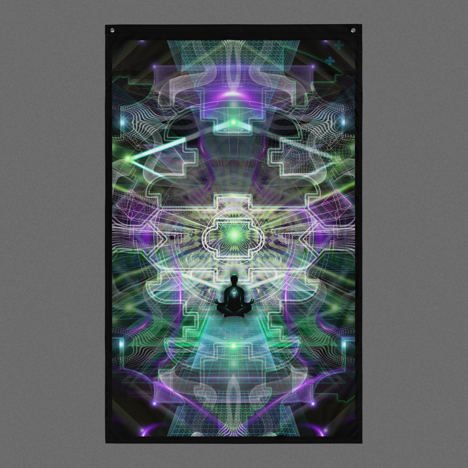 The Psynergy close-up visionary art tapestry features a symmetrical composition of layered translucent geometry, glowing nodes, and radiating linear forms converging around a small seated figure, rendered in purples, greens, and blues against a dark background. Under UV and RGB lighting environments, the colors shift, glow, and transform, bringing the artwork to life in immersive settings, making it emphasize harmonic balance within symmetrical layouts, contemplative interior spaces, and close-range meditative displays, and those drawn to radiant node systems, convergent geometry, and UV-reactive visionary art centered on energetic coherence and inner alignment.