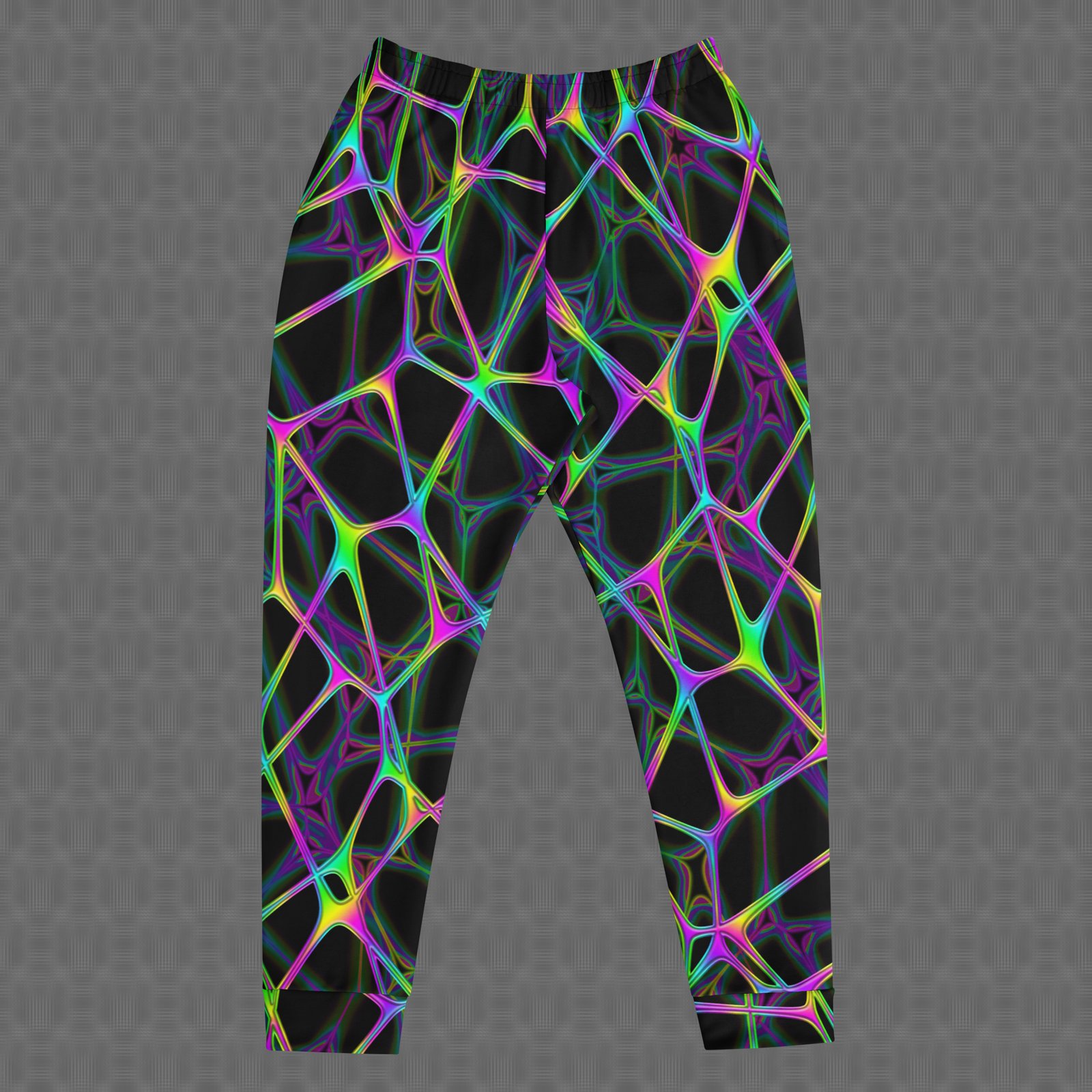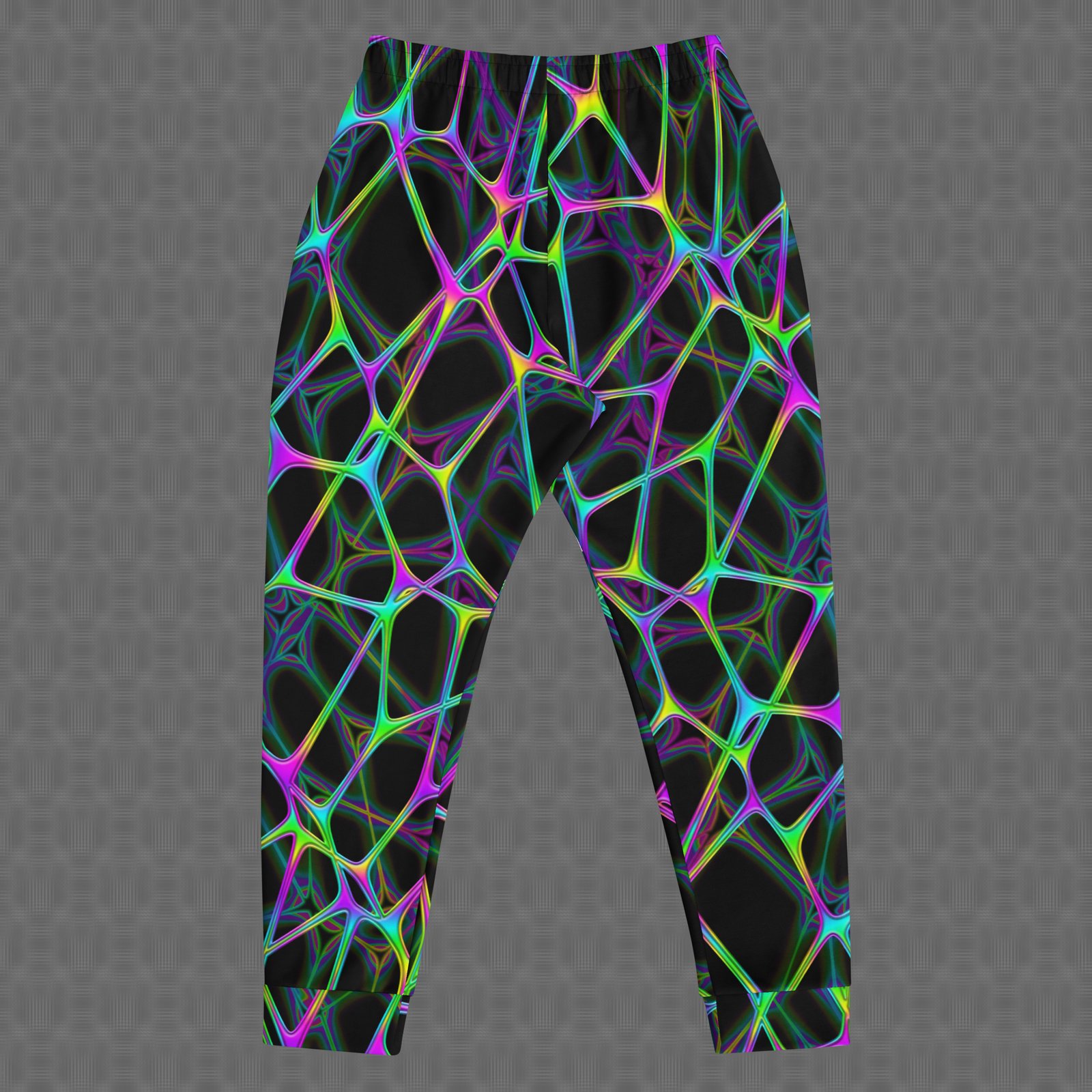 The slim fit and cuffed ankles create a clean, modern silhouette, while deep front pockets and a drawstring waist provide practical, secure comfort. Printed with UV-reactive, fade-resistant color on recycled materials, these joggers are made to moveโ€”whether you’re lounging, dancing, or out on the go.
