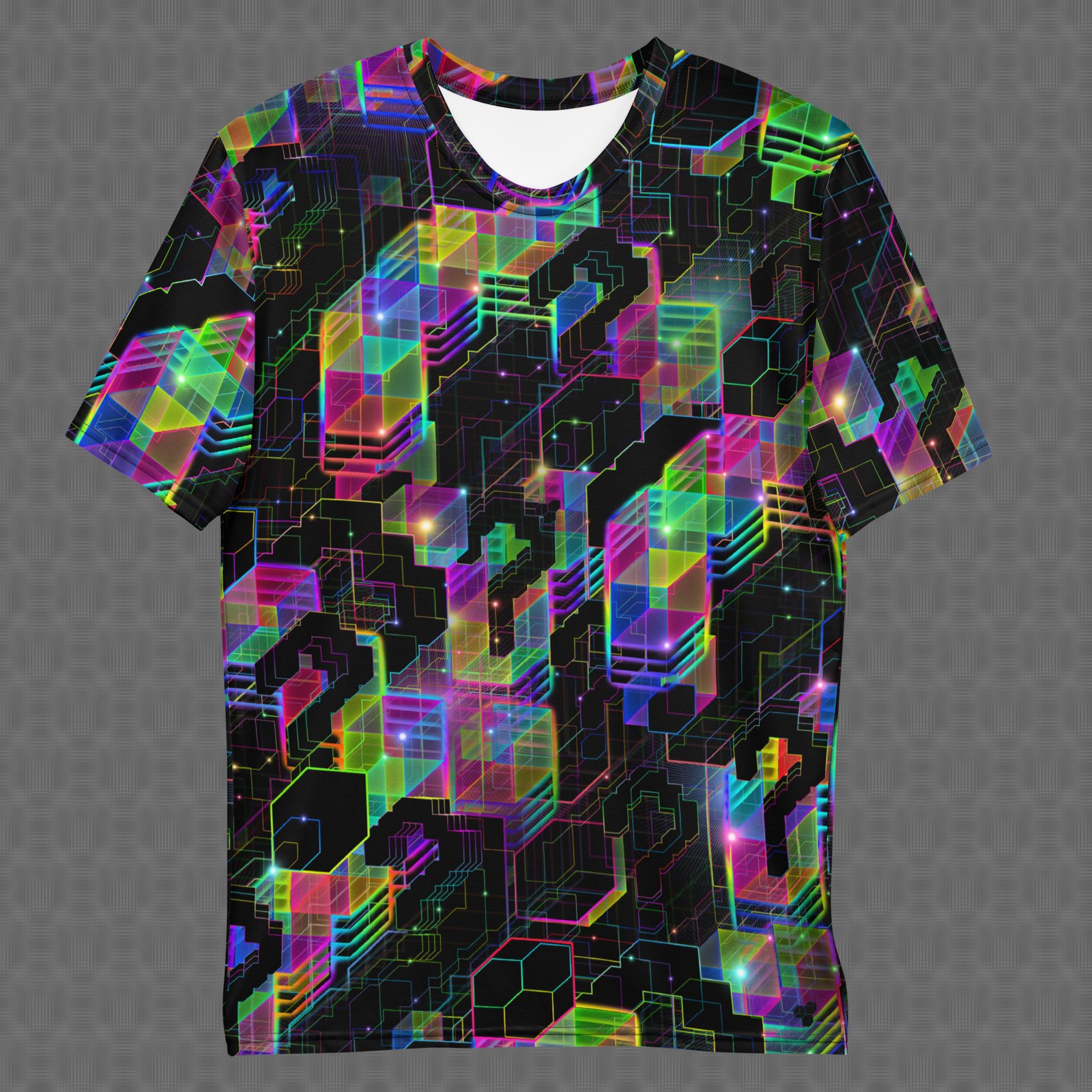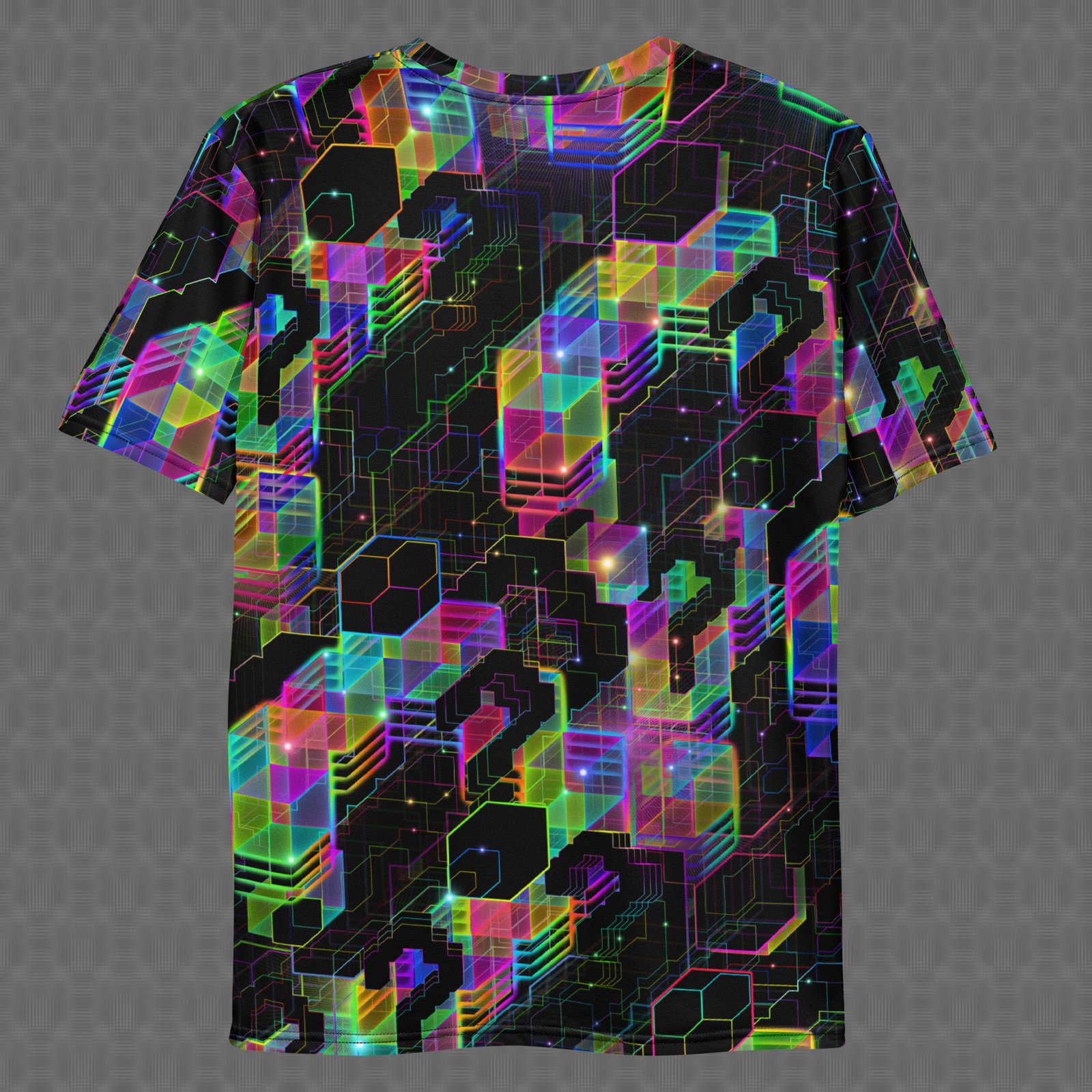 The Question Everything all-over t-shirt features a dense black field overlaid with neon rainbow pixel question marks, circuit-like pathways, and fractured geometric tiles in shifting cyan, magenta, green, and yellow. made to commemorate Trip-hop producer Dave Tipper’s last show at Red Rocks. Under UV and RGB lighting environments, the colors shift, glow, and transform, bringing the artwork to life in immersive settings, making it ideal for psychedelic streetwear enthusiasts, festival and concert wear, immersive art and music environments, statement-driven everyday styling, and those drawn to pixel symbolism, circuit geometry, and UV-reactive design.