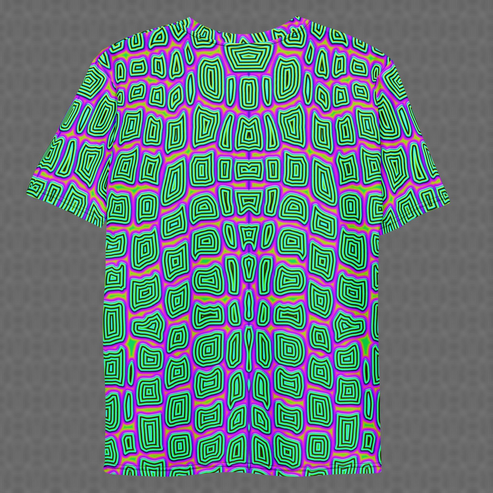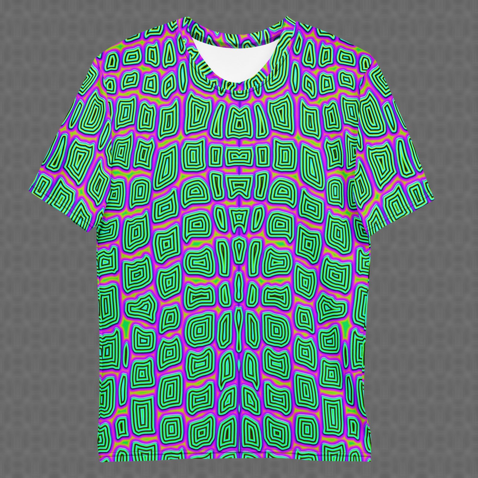 The Reptilian all-over t-shirt features bold, repeating scale-like geometry in electric green and violet that creates a hypnotic pattern with a distinctly reptilian rhythm. Under UV and RGB lighting environments, the colors shift, glow, and transform, bringing the artwork to life in immersive settings, making it tap into primal visual rhythms, high-contrast pattern environments, and assertive statement wear, and those drawn to reptilian scale geometry, instinct-driven repetition, and UV-reactive design.