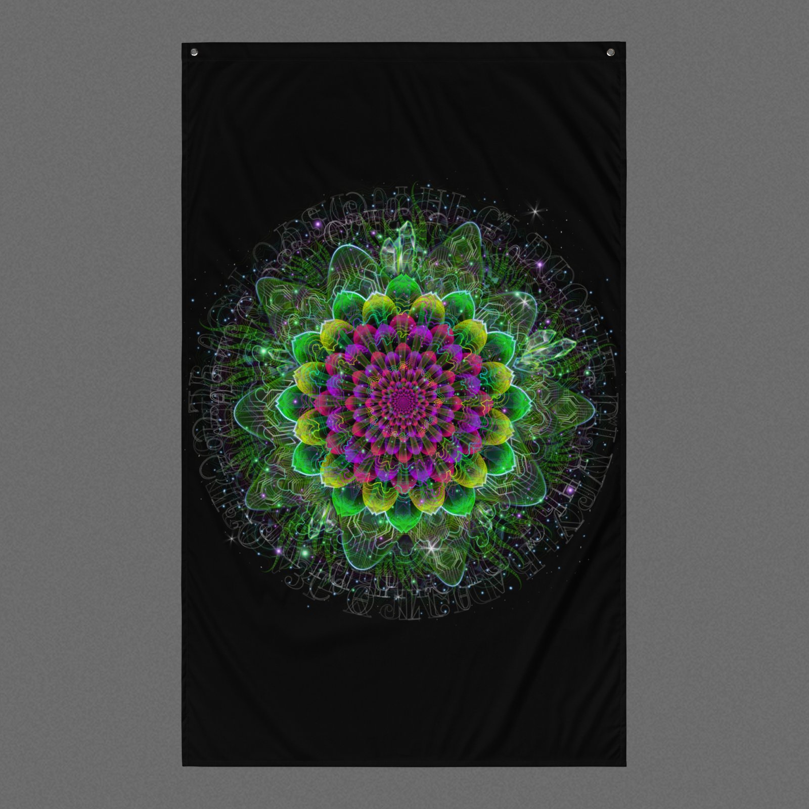 The Astral Flora visionary art tapestry features a circular floral mandala composed of layered petal-like forms, intricate linework, and glowing gradients in green, purple, and pink set against a dark background. Under UV and RGB lighting environments, the colors shift, glow, and transform, bringing the artwork to life in immersive settings, making it bloom within nature-infused visual spaces, immersive ambient interiors, and harmony-centered wall displays, and those drawn to floral mandala symbolism, layered petal geometry, and UV-reactive visionary art.