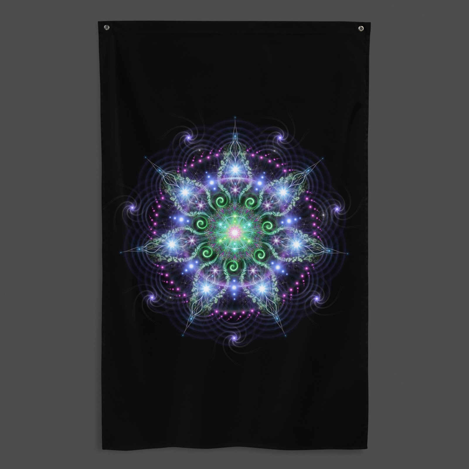 The vibrant high-resolution, fade-resistant psychedelic print delivers vivid color and detail that won’t wash out over time. Finished with metal grommets for easy hanging a great statement piece designed for visual immersion. 61 x 38 inches