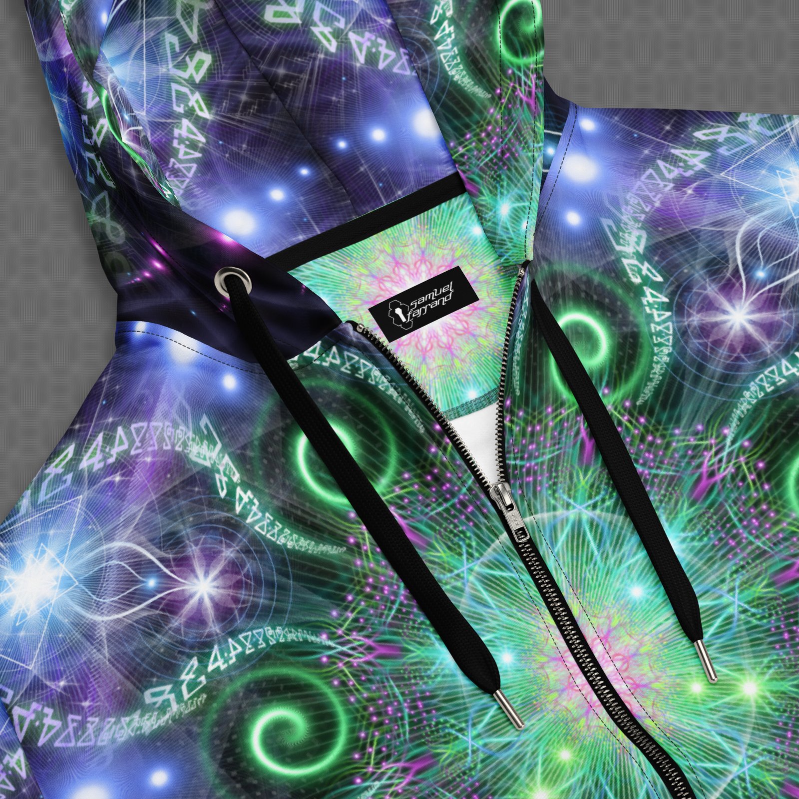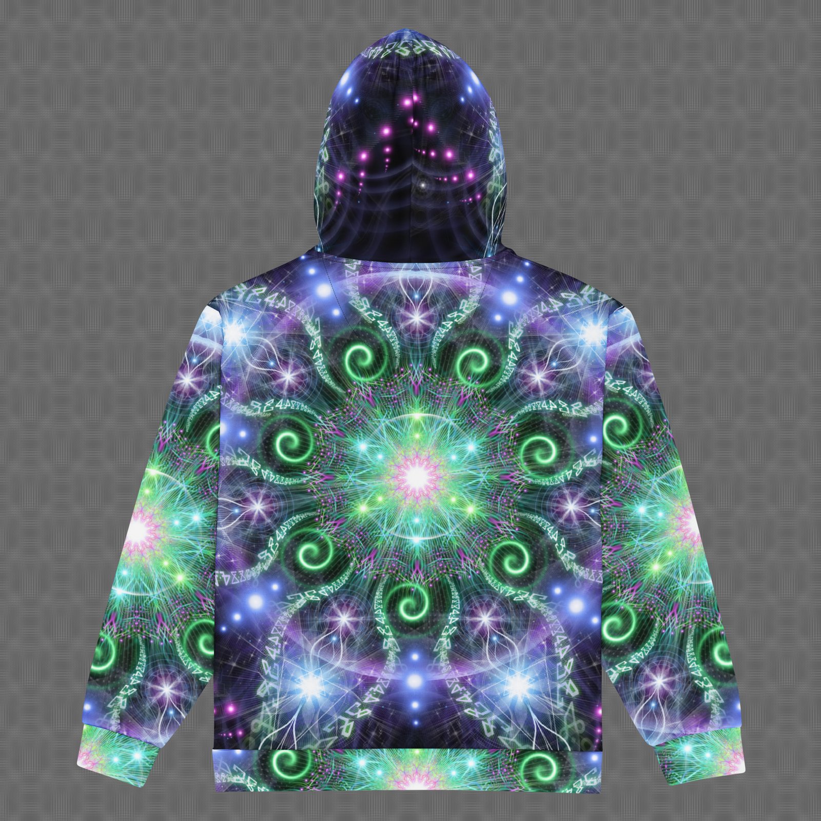 The Soul Star all-over zip hoodie features a vivid psychedelic print with a green, blue and teal cosmic mandala design depicting glowing luminous orbs and alien glyphs. Under UV and RGB lighting environments, the colors shift, glow, and transform, bringing the artwork to life in immersive settings, making it ideal for cosmic-themed psychedelic spaces, visionary art gatherings, and environments centered on celestial symbolism, encoded glyphs, and expanded states of awareness.