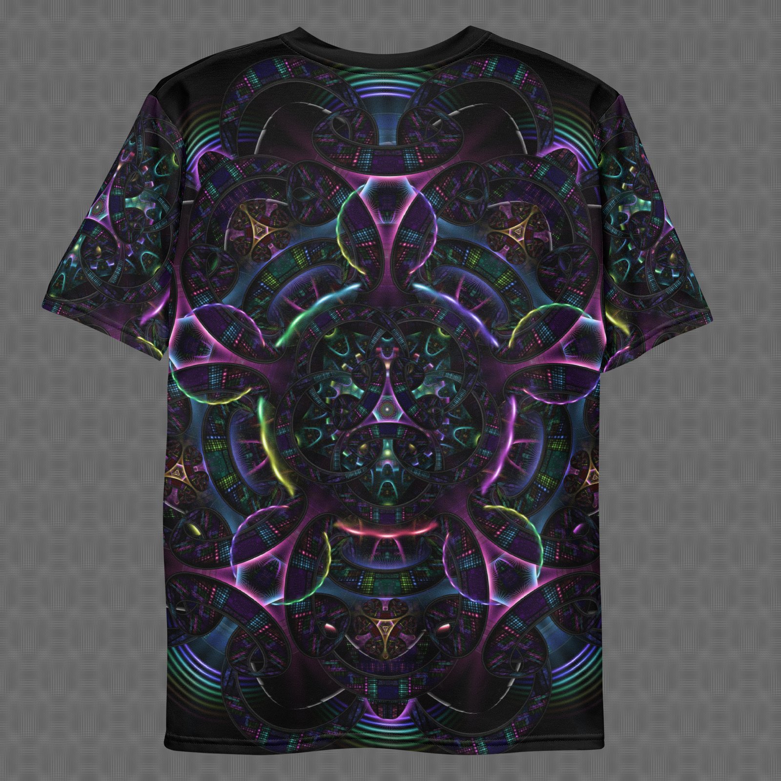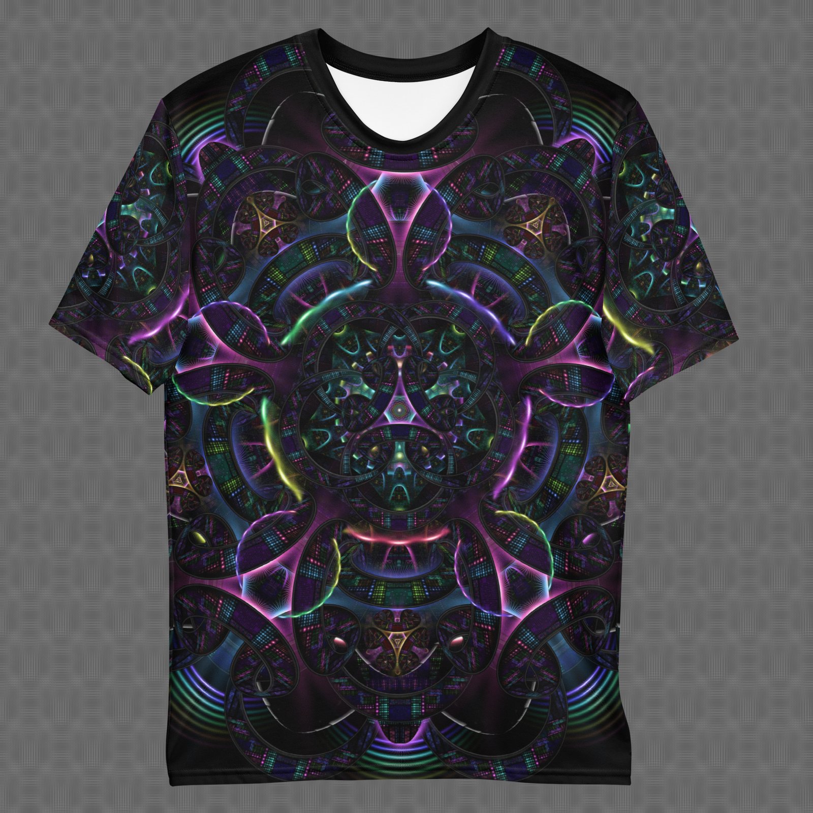 The Synaptic Bloom all-over t-shirt features An intricate, symmetrical composition design of luminous neural forms and iridescent circuitry that radiates outward like a blooming synaptic network suspended in dark space. Under UV and RGB lighting environments, the colors shift, glow, and transform, bringing the artwork to life in immersive settings, making it emerge naturally within art-forward expression, immersive sensory environments, and concept-driven everyday wear, and those drawn to synaptic geometry, organic circuitry, and UV-reactive design.