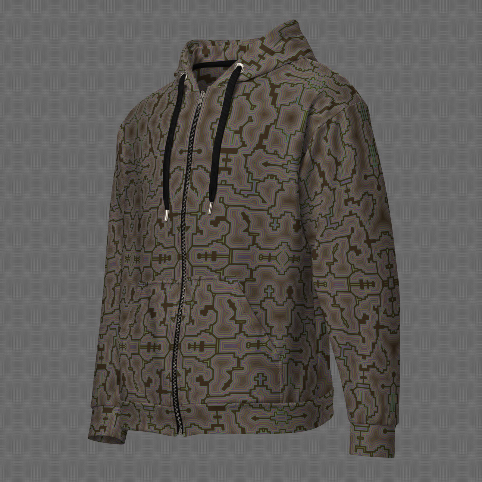 The Techno Shamanic Bark all-over zip hoodie features dense, dark brown branching linework in earthy bark tones, blending circuit-like geometry with organic textures for a grounded, forest-born ritual-tech aesthetic. Under UV and RGB lighting environments, the colors shift, glow, and transform, bringing the artwork to life in immersive settings, making it ideal for forest-based festivals, woodland ritual environments, and spaces where arboreal symbolism, organic networks, and techno-shamanic patterning intersect.